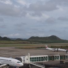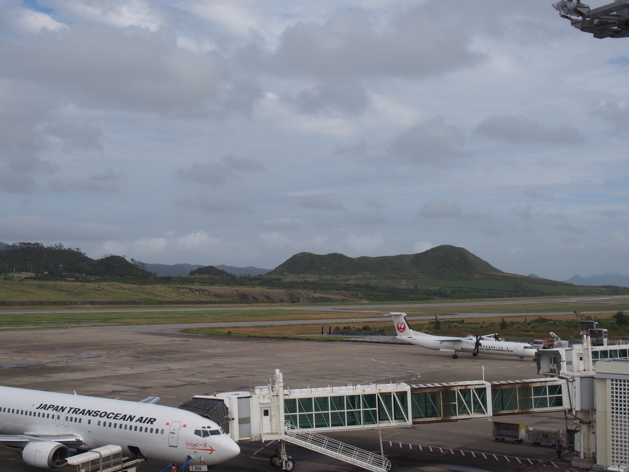 新石垣空港の展望台からカラ岳を眺めました。新石垣空港の北西側にあります。滑走路の向こう側にある小高い山(丘)です。カラ岳は木々はない下草のある山のようです。滑走路の飛行機や離着陸している飛行機の向こう側にカラ岳がよく見えます。