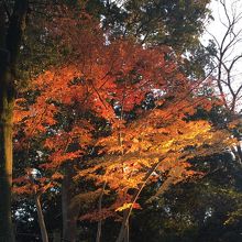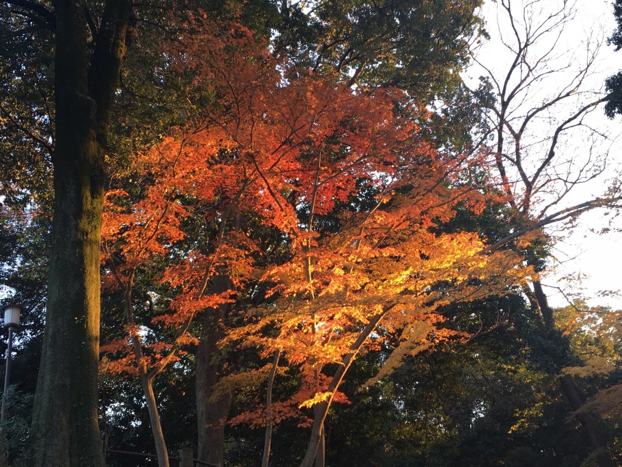 境内に紅葉があり、夕日に照らされていて、とっても綺麗でした。