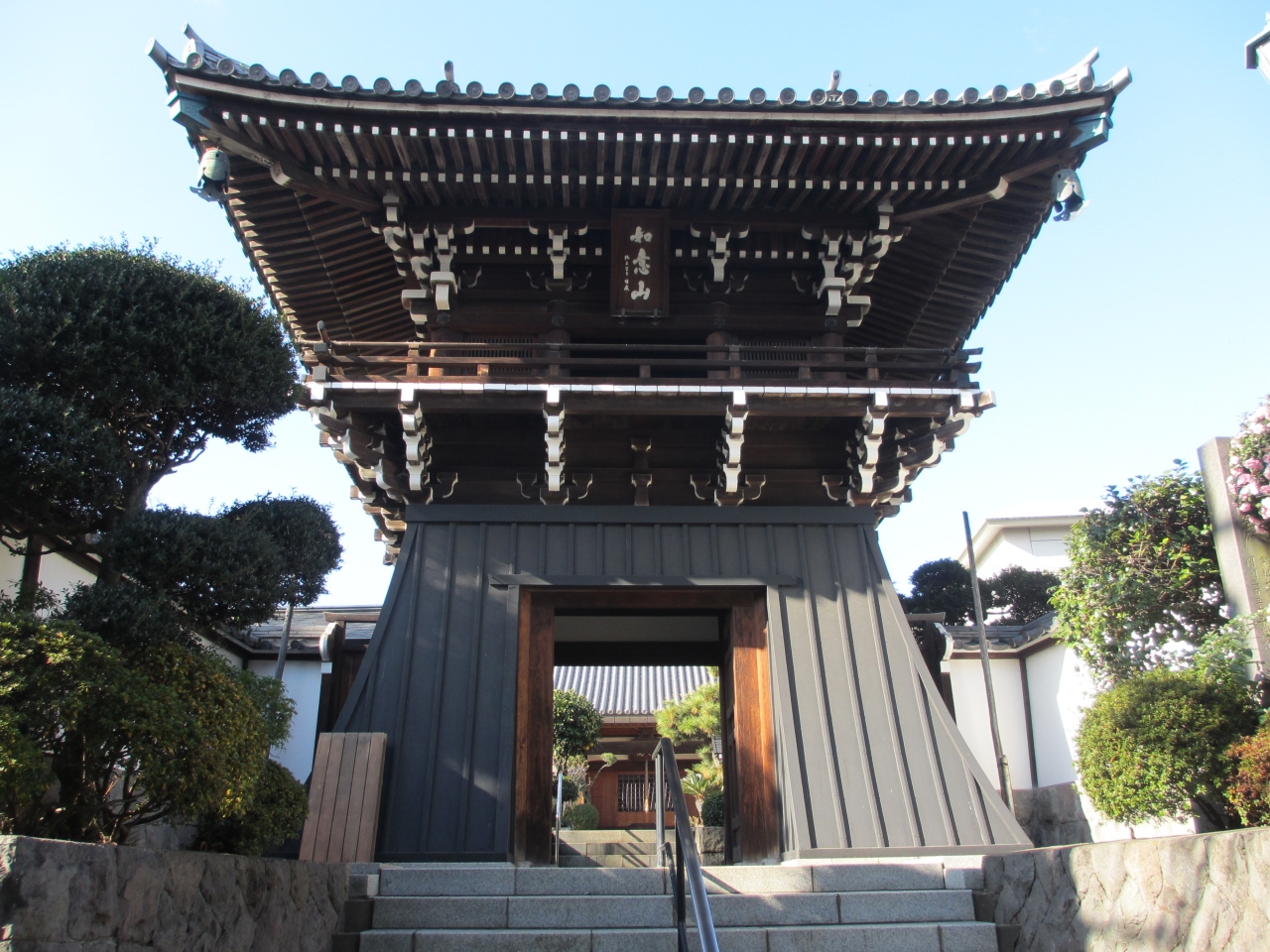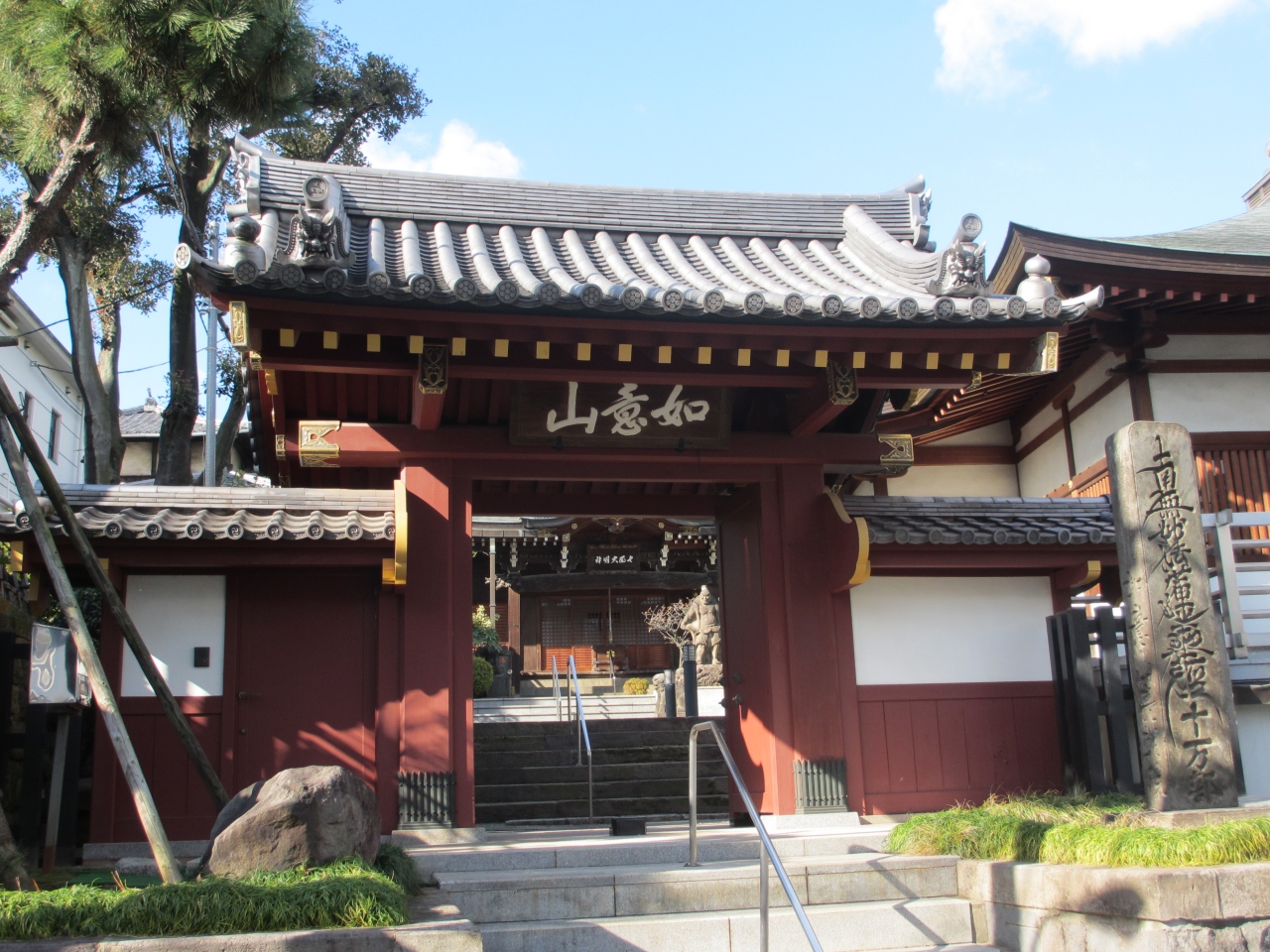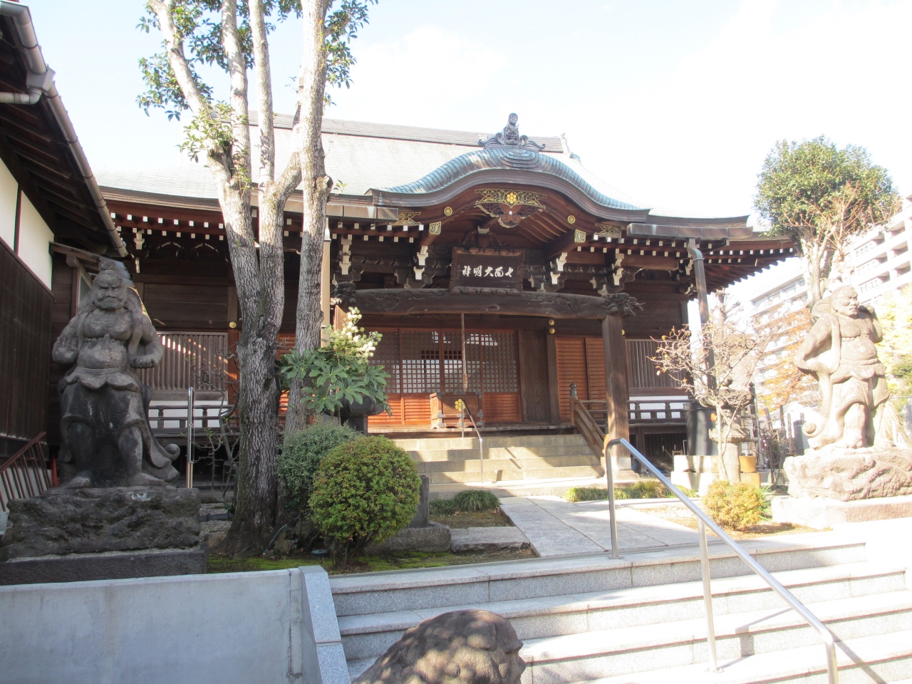 都電荒川線・面影橋駅から1分ほどのところにある大きな寺院です。朱色の山門の屋根には鬼瓦が取り付けられています。山門の隣りには、山門よりも風格が感じられる二階建ての鐘楼が建ち、二階に梵鐘が置かれています。山門を入った正面に建つ七面堂の前には、石で作られた一対の金剛力士像が安置されています。木製の仁王像が多い中、石の仁王像を見たのは初めてでした。立派な山門と風格ある鐘楼、珍しい仁王像を見ることができ