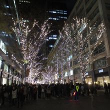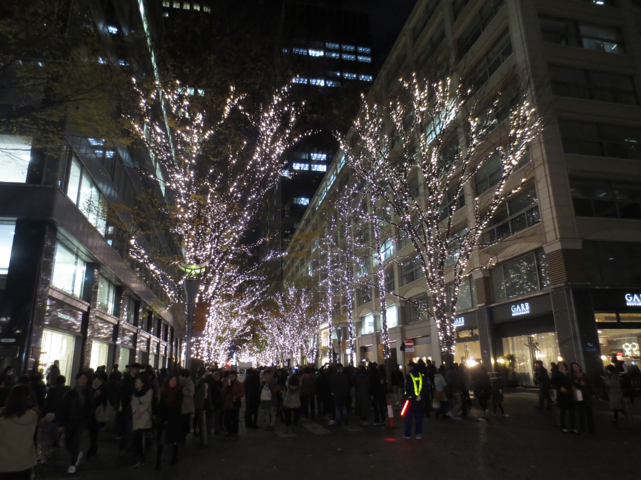 丸の内仲通りに展開するイルミネーション。もう毎年恒例です。通り沿いのイルミネーションはずっと奥まで続いていて、とてもきれいです。派手な装飾もなく、シンプルですが、それがかえって上品な印象を受け、丸の内ならでは。しかし、人がすごい。訪れたのは仕事帰りの平日。平日にしてこの混雑ぶりとはね。