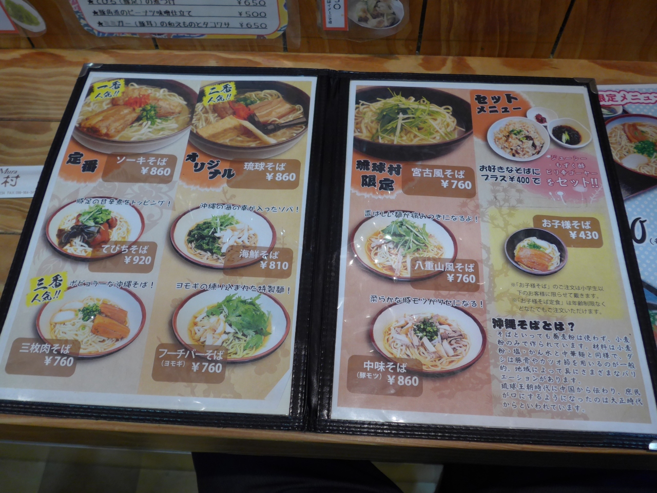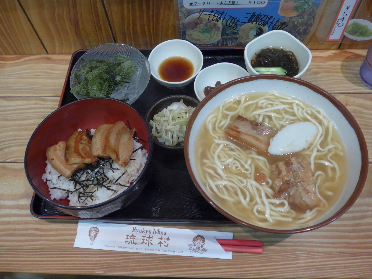 琉球村定職は三枚肉そば・ラフティ丼・モズク・海ブドウ・ミミガー等