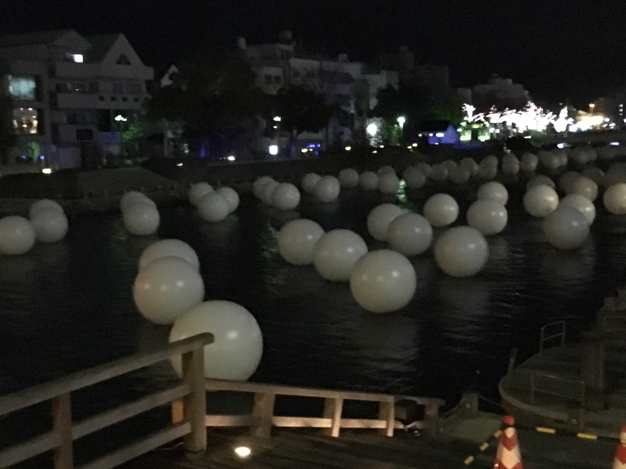 徳島で実施中のLEDイベントの一つで徳島駅から5分ぐらいの所にある新町川の川沿いの公園で開催中のチームラボの風船を照らしたイベントに見入る。もう少しじっくり見ればよかったが、飲み会に遅刻しそうであったので、深夜のイベント終了後に写真を撮りました。