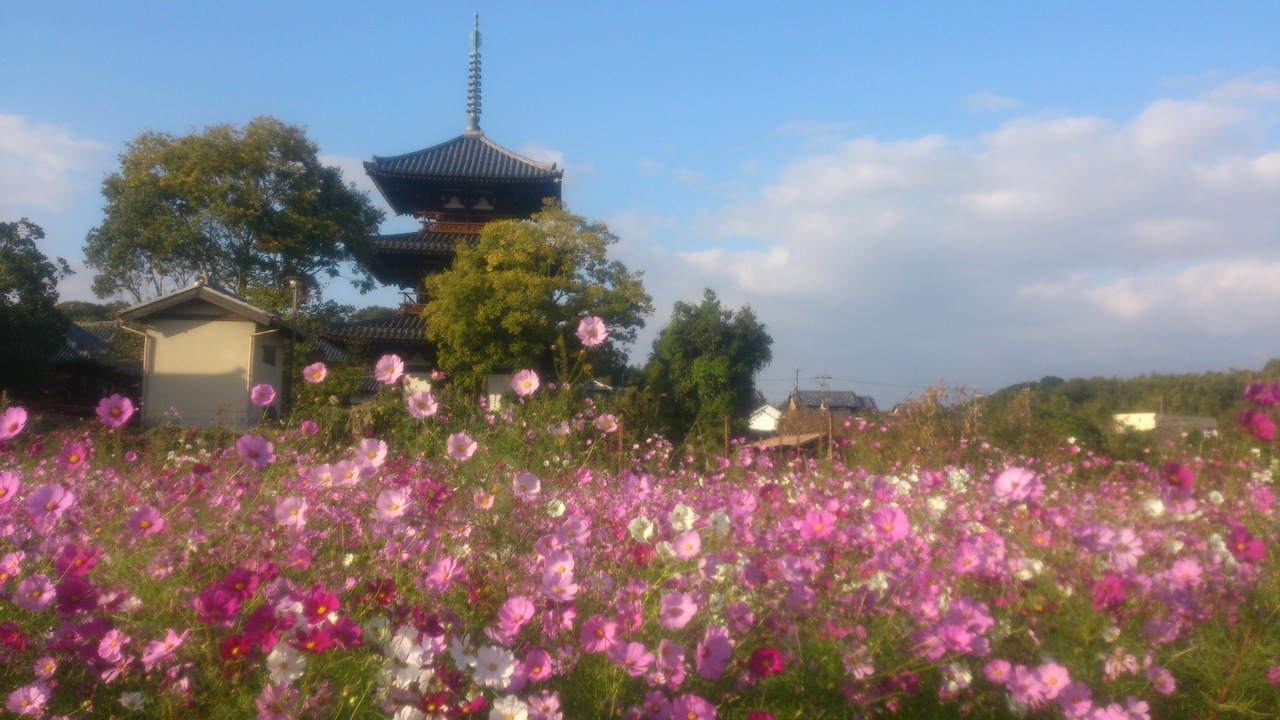 今回コスモスの時期に訪れましたが、斑鳩ののどかな里に辺り一面コスモスが咲き乱れ、とても素敵な風景でした。
