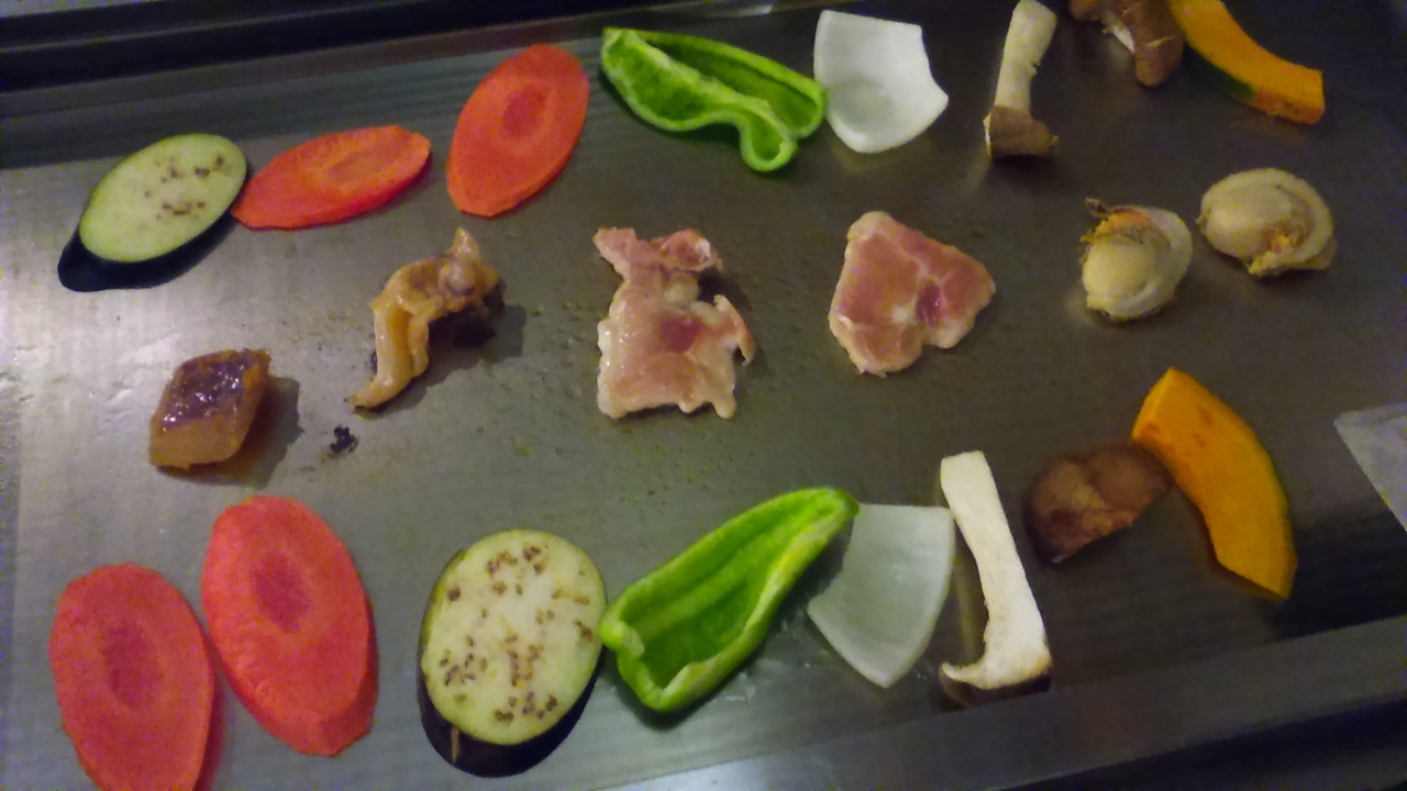 ビュッフェコーナーからお肉や海鮮や野菜をとってきて、