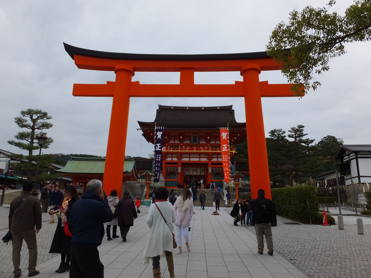 JRの稲荷駅からすぐに境内。その正面の鳥居のむこうにそびえるのがこの朱色の大きな楼門です。