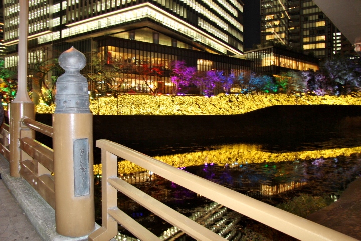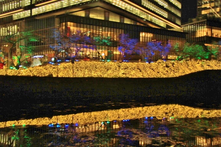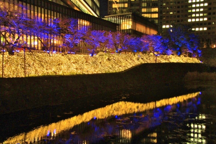 弁慶橋から今年竣工した東京ガーデンテラス紀尾井町の「テラスの小道」のイルミネーションを綺麗に見ることが出来ました。桜並木には赤、ピンク、緑、青の単色のライトアップや一度に数色のライトアップなど変化に富んでいました。水面に映るイルミネーションも綺麗でした。