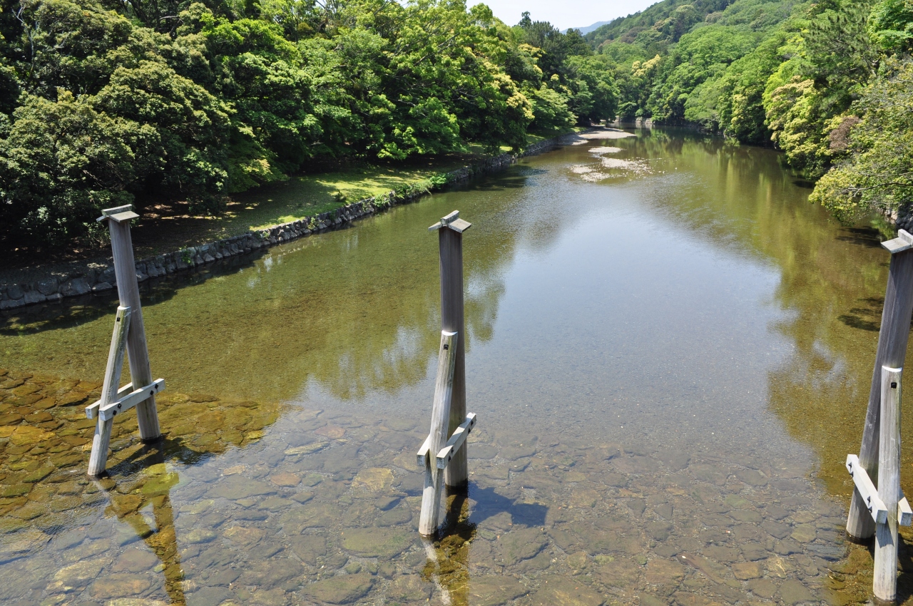 伊勢神宮内宮に着きますと、まずは宇治橋を渡って参拝することが多いかと思いますがその、宇治橋がかかる川が五十鈴川になります。 水深は浅く、透き通った水がとてもきれいでした。宇治橋を渡ってしばらく進むと右手に五十鈴川の川辺まで近づくことができる五十鈴川御手洗場と呼ばれる場所があり、五十鈴川の水で手などを洗うことができます。多くの参拝客の方が川辺まで行かれており、私もそれにならって手を洗いましたが冷たくて気持ちよく、すっきりとした気分で参拝することができましたのでお勧めです。