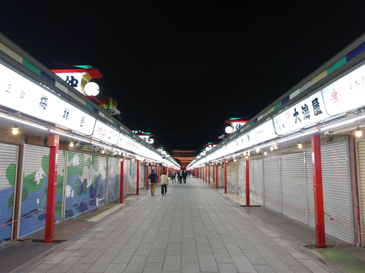 浅草で夕食を終えてから仲見世に伺うと、まずほとんどのお店が閉店しておりシャッターが降りています。個人的にはシャッターが降り、ゴーストタウンのようになった仲見世もとても好きな光景です。昼間の喧騒とのギャップが何度訪問しても新鮮に感じます。