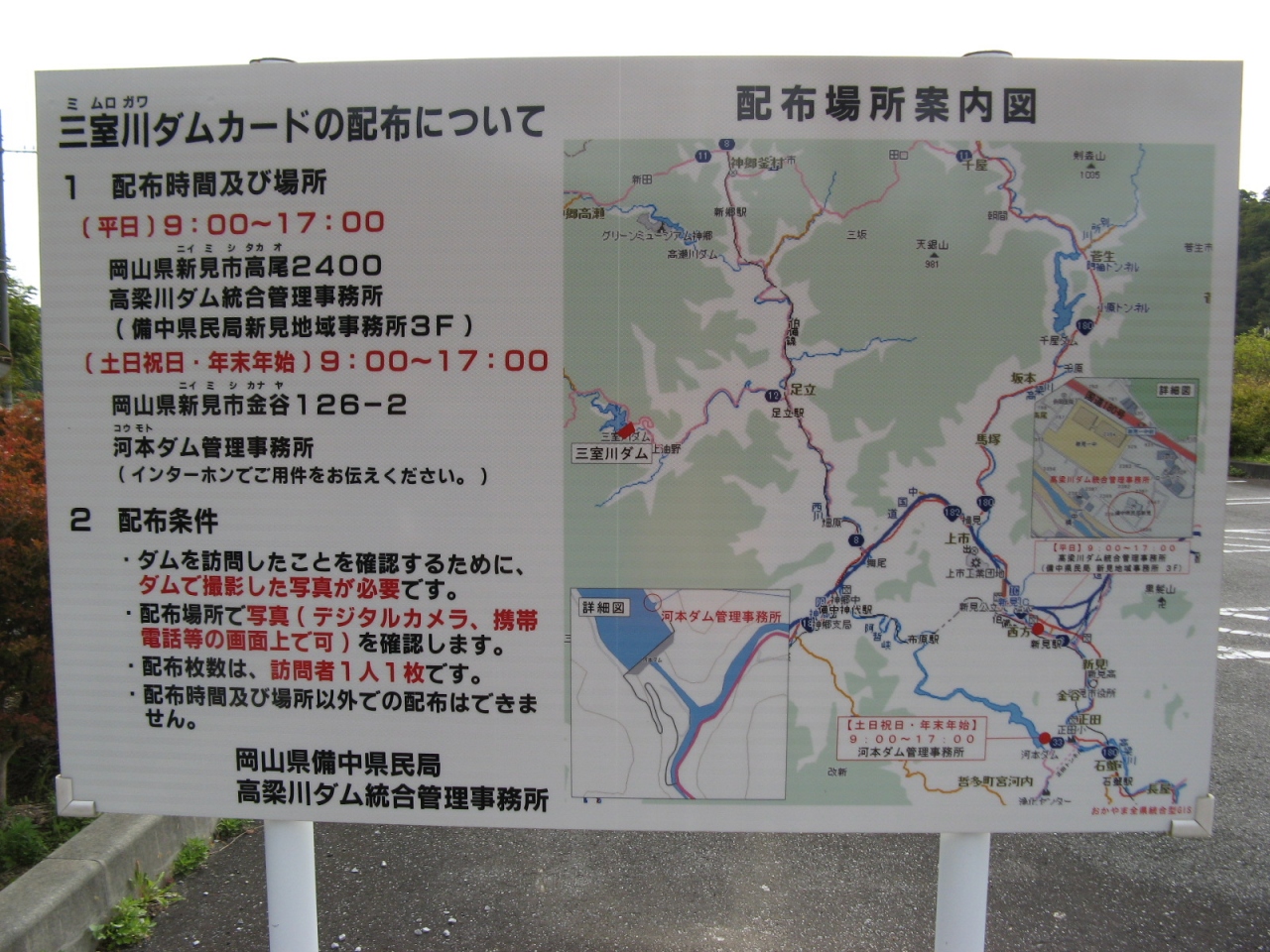 管理所は無人になっていて、ダムカードの配布についての説明板(添付写真を参照ください)があったので、ここを見学した後、“河本ダム”の管理所に立ち寄ってダムカードを頂くことができました。土日・祝日に河本ダムを見学される方は、まず、三室川ダムに立ち寄って、訪れた証拠写真を持って河本ダムの管理所に伺うと両方のダムカードを頂けるので見学の順序を決めるときに参考にしてください。