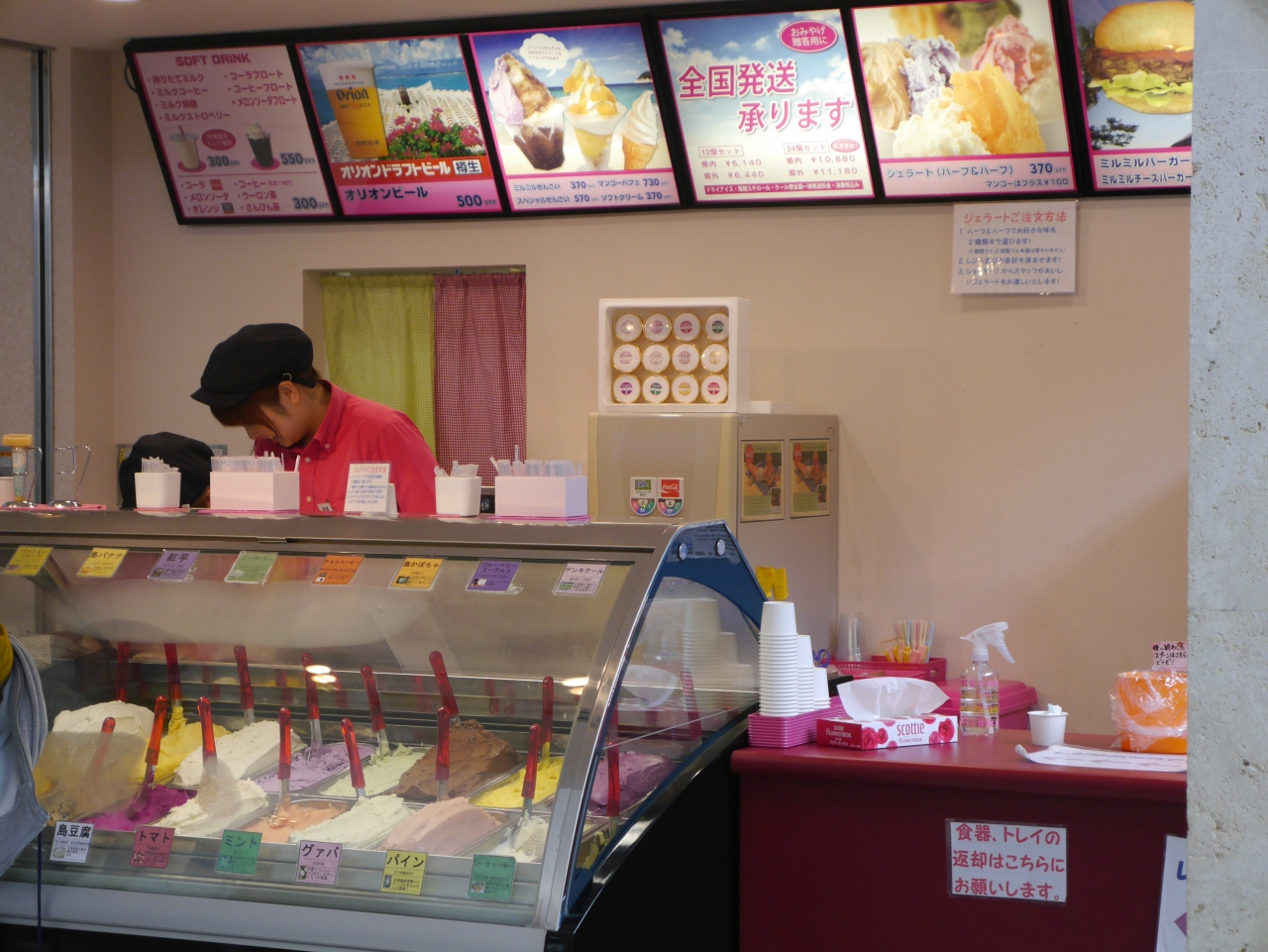 石垣空港の一階、土産物店が取り囲むロビーの一画にあり、空港に入るとすぐ目につく場所にあります。島豆腐、シークァーサー、島バナナ、紅芋、島かぼちゃ等沖縄らしいメニューが並んでいます。店の前は共用のテーブルスペースになっているので出発前に頂けます。