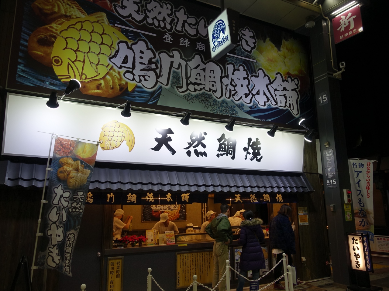 「浅草新仲見世商店街」の夜は早く、食後の散策でホテルに戻る際にはほとんどのお店のシャッターが降りていました。シャッター街と化したアーケード商店街もなかなか面白いと思って歩いていると、まだ営業中でお客さんの姿が見られるたい焼き屋さんの姿がありました。宿泊先のホテルで食べる分を購入しましたが、味はよく、新仲見世ならではの外観も魅力的でした。