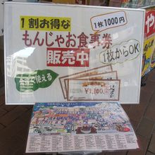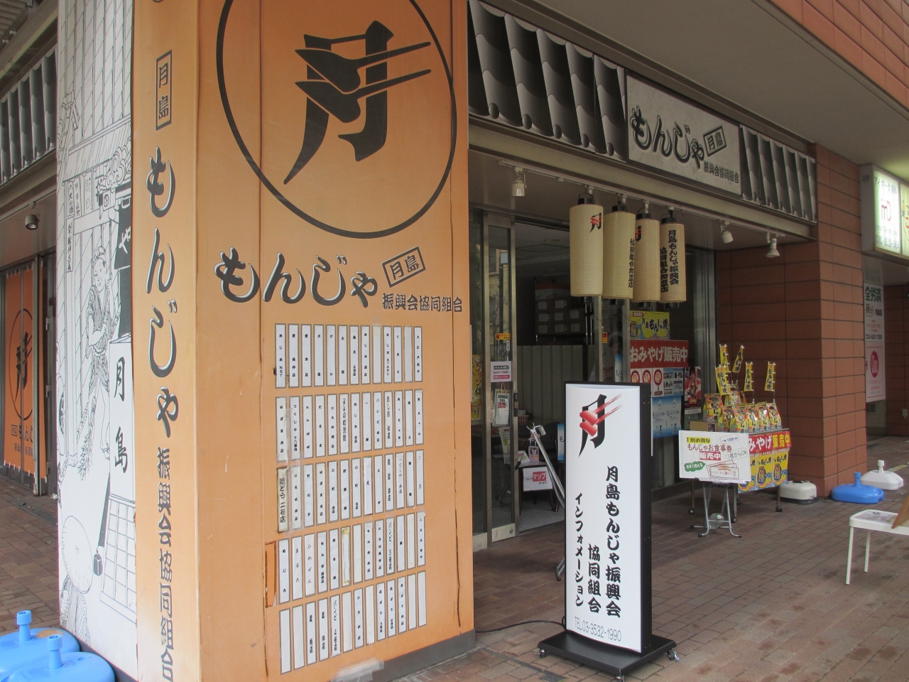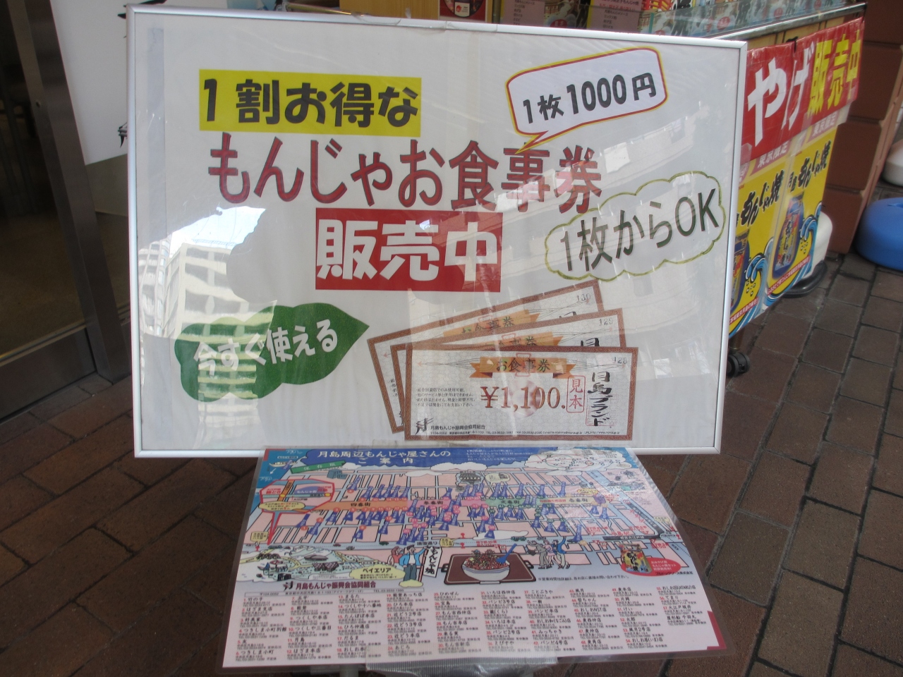 佃を散策した後にもんじゃを食べにもんじゃストリートへ向かいました。月島駅7番出口近くのビルの1階に月島もんじゃ振興会協同組合があります。Tシャツや土産物を販売していますが、目玉は食事券です。1000円で1100円分の食事支払いに使える券です。月島ブランドのポスターが貼ってある店で使えます。2枚券を購入し、月島ブランドの店を物色しながら入りました。もんじゃだけではなく飲み物や他の料理の会計時に金券として使えるのでお得です。もんじゃストリートには協同組合に加盟していないもんじゃ屋があることに気が付きました。月島で食事をする前に寄ることをおすすめします。