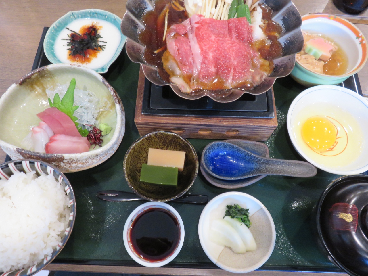 やや甘辛い和牛すき焼き鍋をはじめ、お刺身やとろろなど、食べたい和食がてんこ盛りなおいしさ