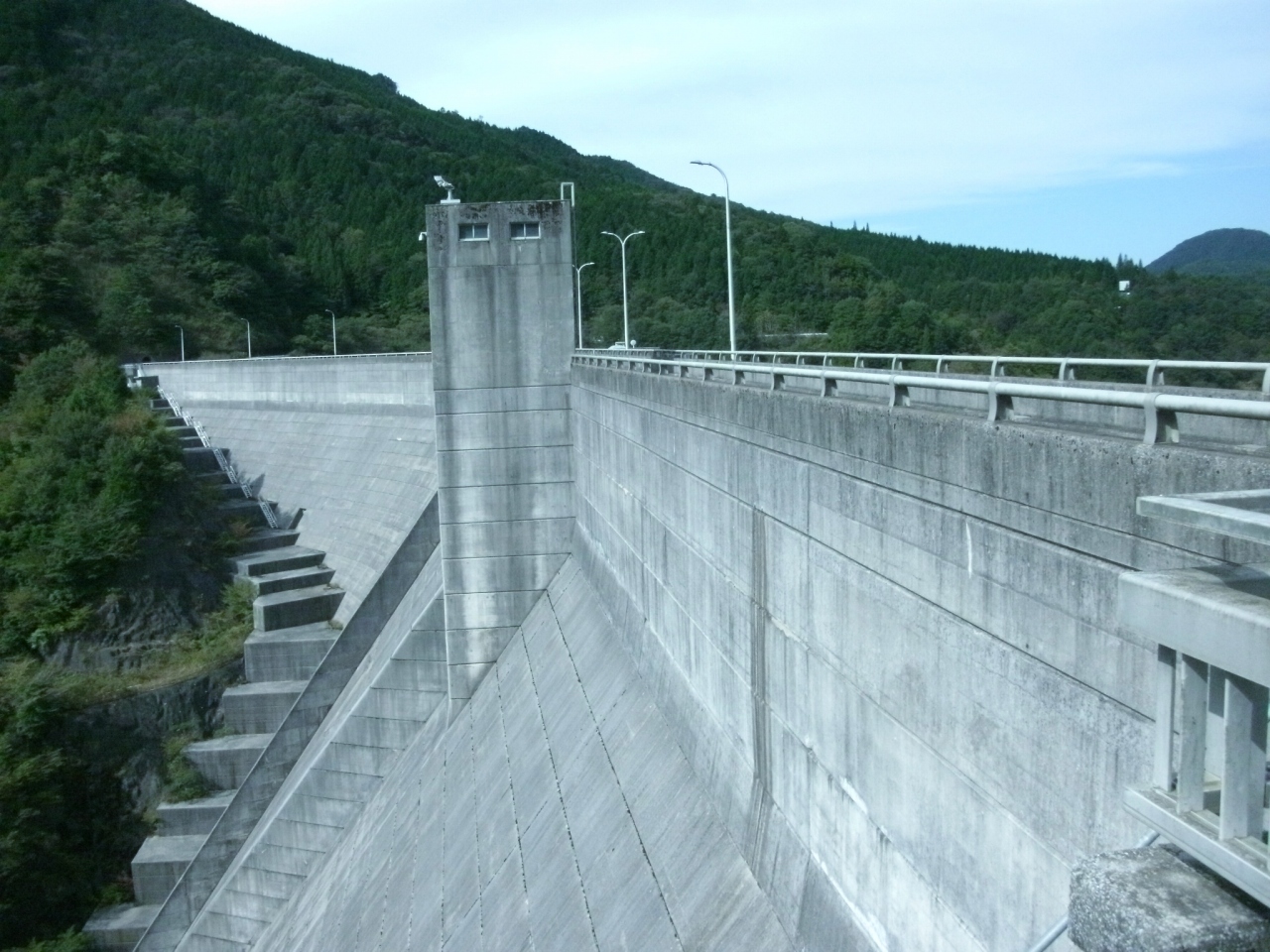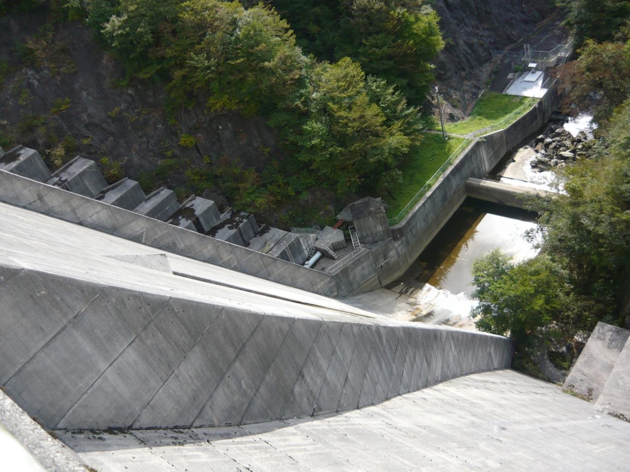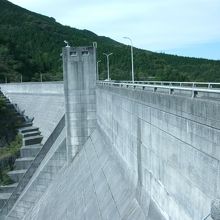 竣工が1982年でそれほど新しいダムではありませんが、堤体コンクリートの材料が違うのか他のダムに比べて白くて綺麗で、ダム堤体右岸側が下流方向に少し湾曲しているので、一部だけ観るとアーチダムのような雰囲気があります。
