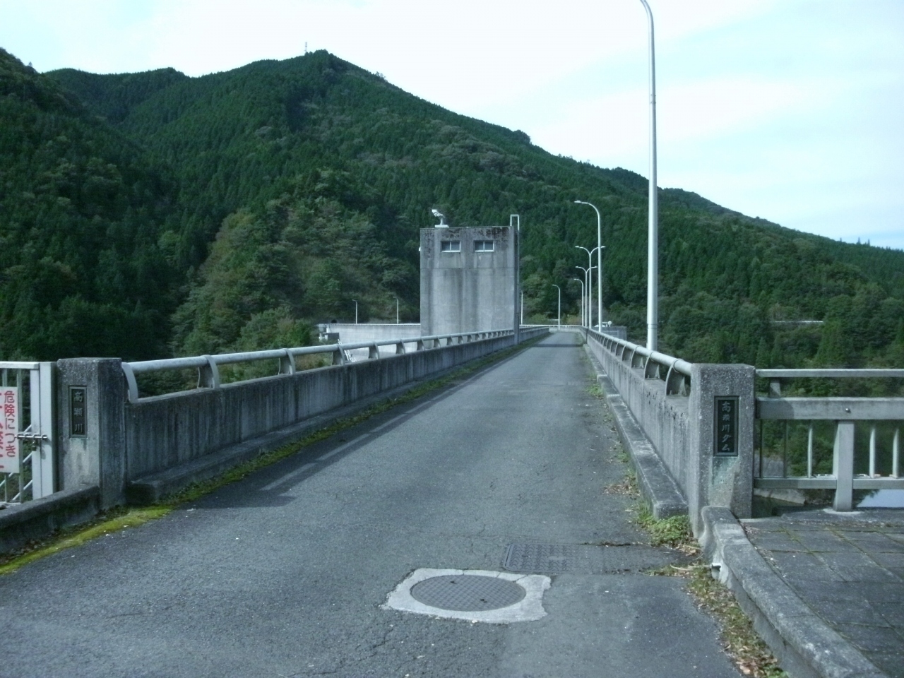 非常用洪水吐き4門を備える自由越流方式のシンプルな構造で、ダム堤体上は車も通行可能となっていて、堤高が67mあるので下流側を覗くとなかなかの迫力があり、常用洪水吐きから放水している様子が見えました。