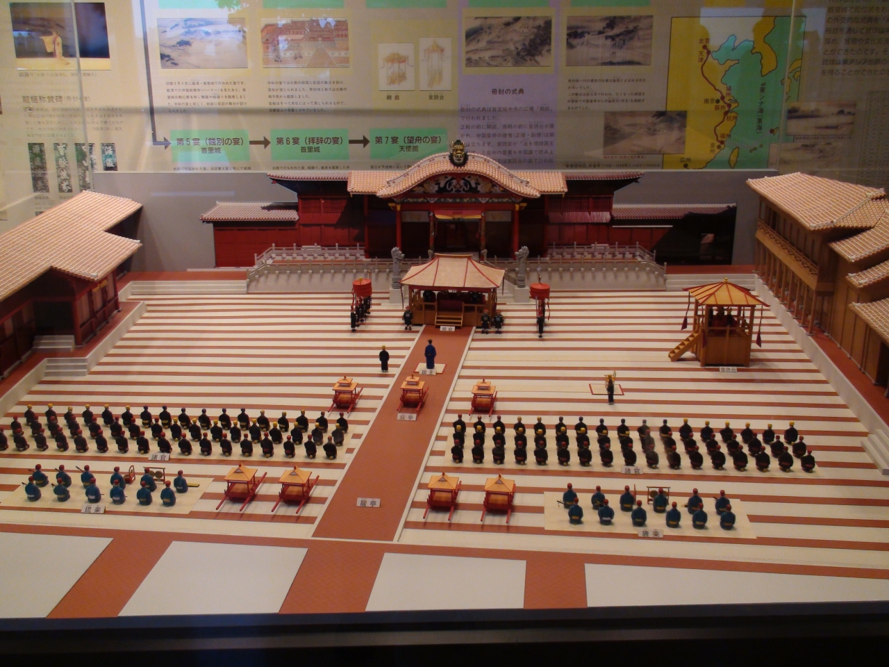 御庭の地面のタイルが紅白の縞模様になっていてきれいだが、奉神門から正殿に伸びる中央の赤い通路(国王や冊封使等だけが通ることを許された)が、なぜ斜めになっているのか?わからないというのが不思議です。