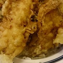 天丼はかき揚げと海老と何か魚っぽいてんぷら。