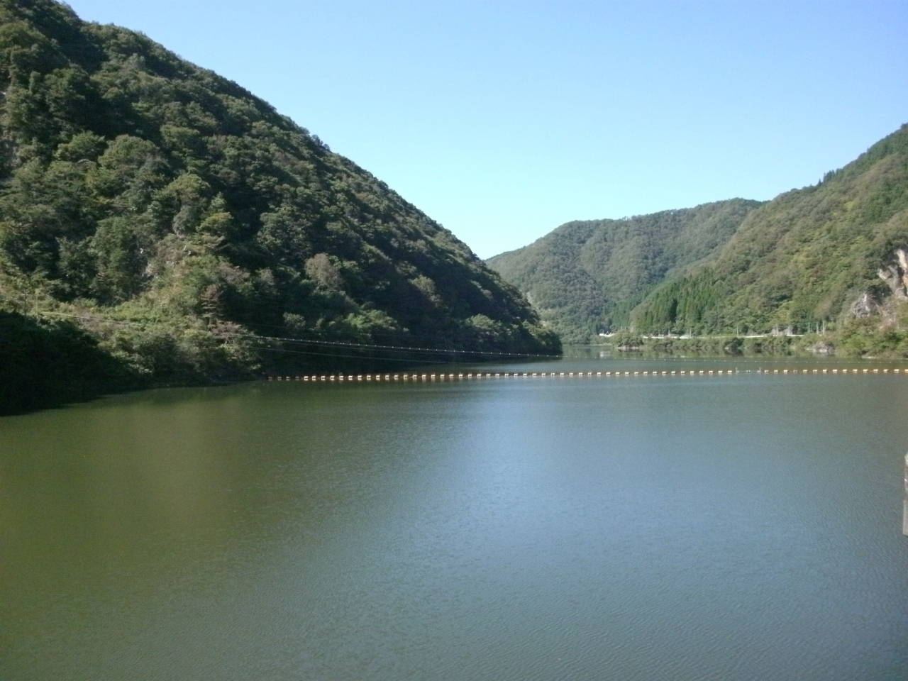 ダム堤体上は車の通行も可能で、堤体上から下流側を覗くと、ダム直下の流れの先に集落も見えてなかなかの風景です。