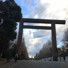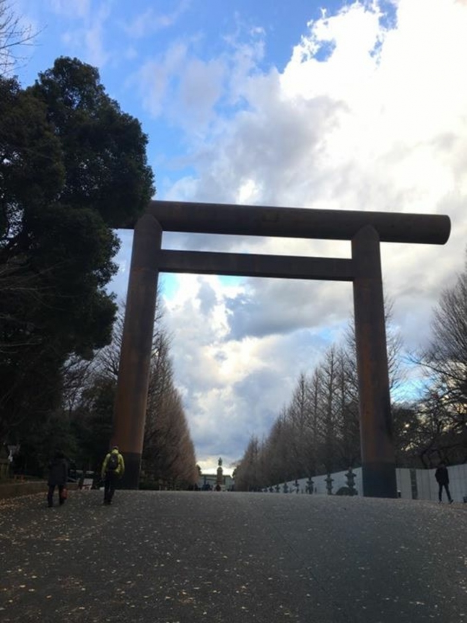 駅から歩いていくと突如大きな鳥居が現れます。靖国神社の第一鳥居は色が剥げたからなのか、赤くありません。錆びがついていて、完全に錆びていました。かなり大きな鳥居で迫力があるだけに残念です。初詣の案内がされていました。