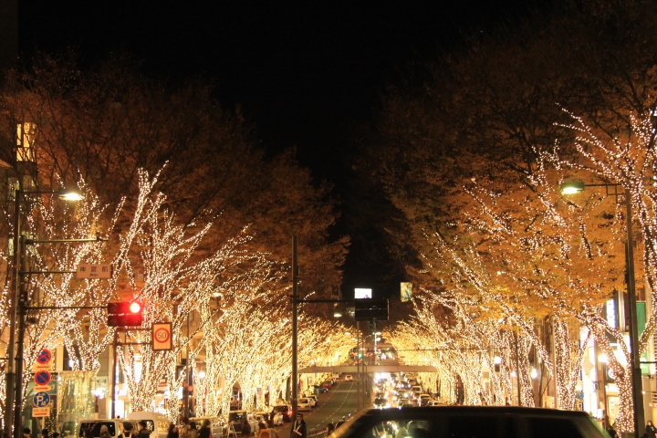 東急プラザ表参道原宿の交差点から表参道交差点までケヤキ並木がシャンパンゴールドのイルミネーションで飾られてとても綺麗でした。