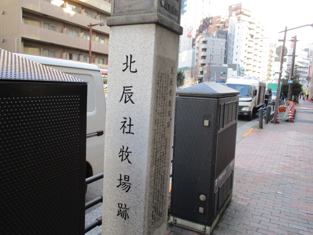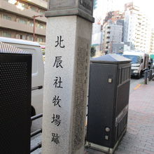 東京メトロの九段下駅3B出口より目白通りを飯田橋方面に歩いて7分ぐらい明治初期、榎本武揚が創設し最盛期には約50頭の乳牛を飼育されていた北辰社牧場跡碑の標柱が立っています。明治初期に榎本武揚が東京のど真ん中に東京農大の原点や酪農の牧場を造ったことに驚きです。現在は残念ながら標柱があるだけで農業と繋がりがあったという面影は全く感じませんが歴史が伝達される貴重な標柱です。