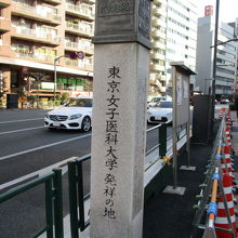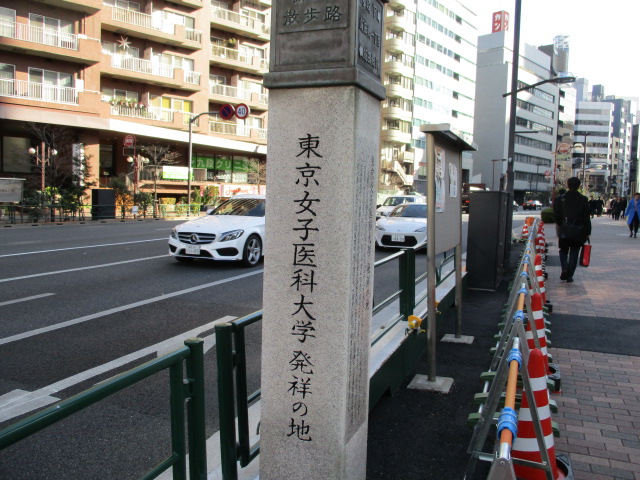 地下鉄東京メトロ九段下駅3B出口より目白通りを飯田橋方面に行き筑土神社を過ぎ歩いて3分ぐらいで目白通り沿いのグランドパレスホテル前の交差点近くに東京女子医科大学発祥の地の標柱がたってます。標柱によると女医であり、教育者としても知られる吉岡弥生が東京女医学校を創設し、関東大震災で被災するまでこの地にあったそうです。標柱のみで残念ですが明治初期のこの辺りは学校設立や牧場、工業もあり開発地で盛り沢山だなと歴史が良く分かります。