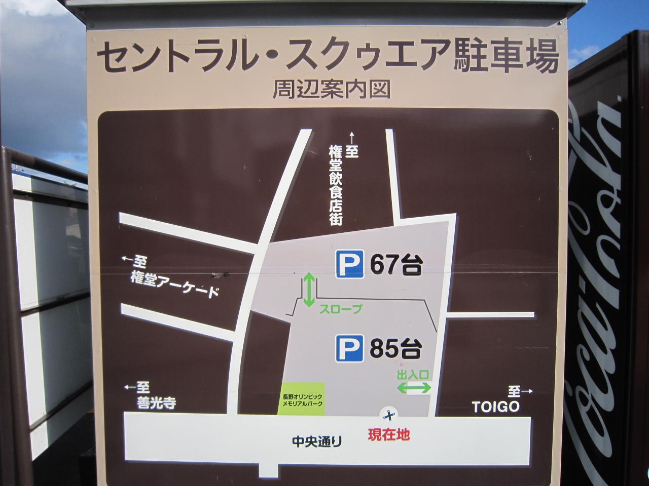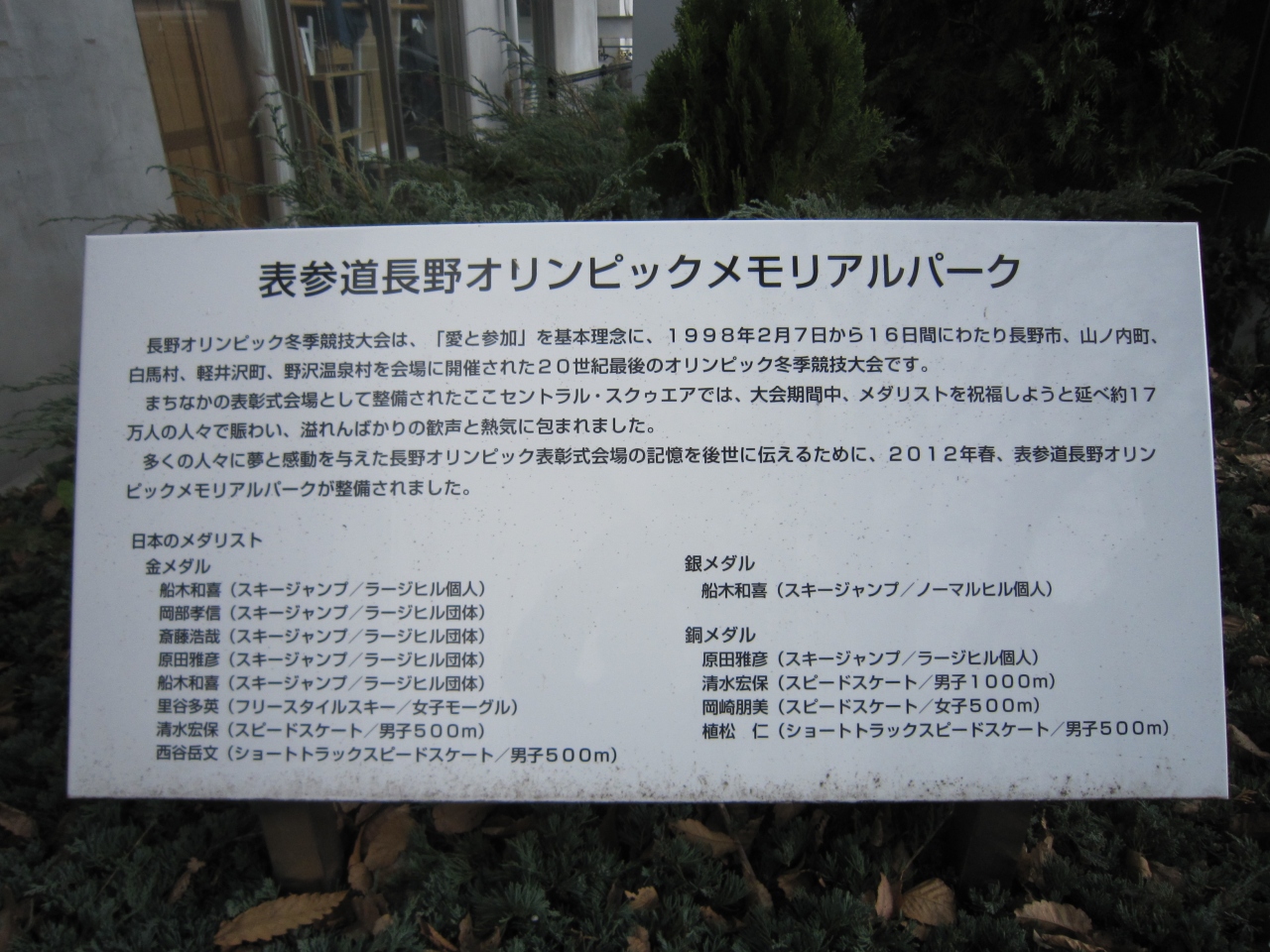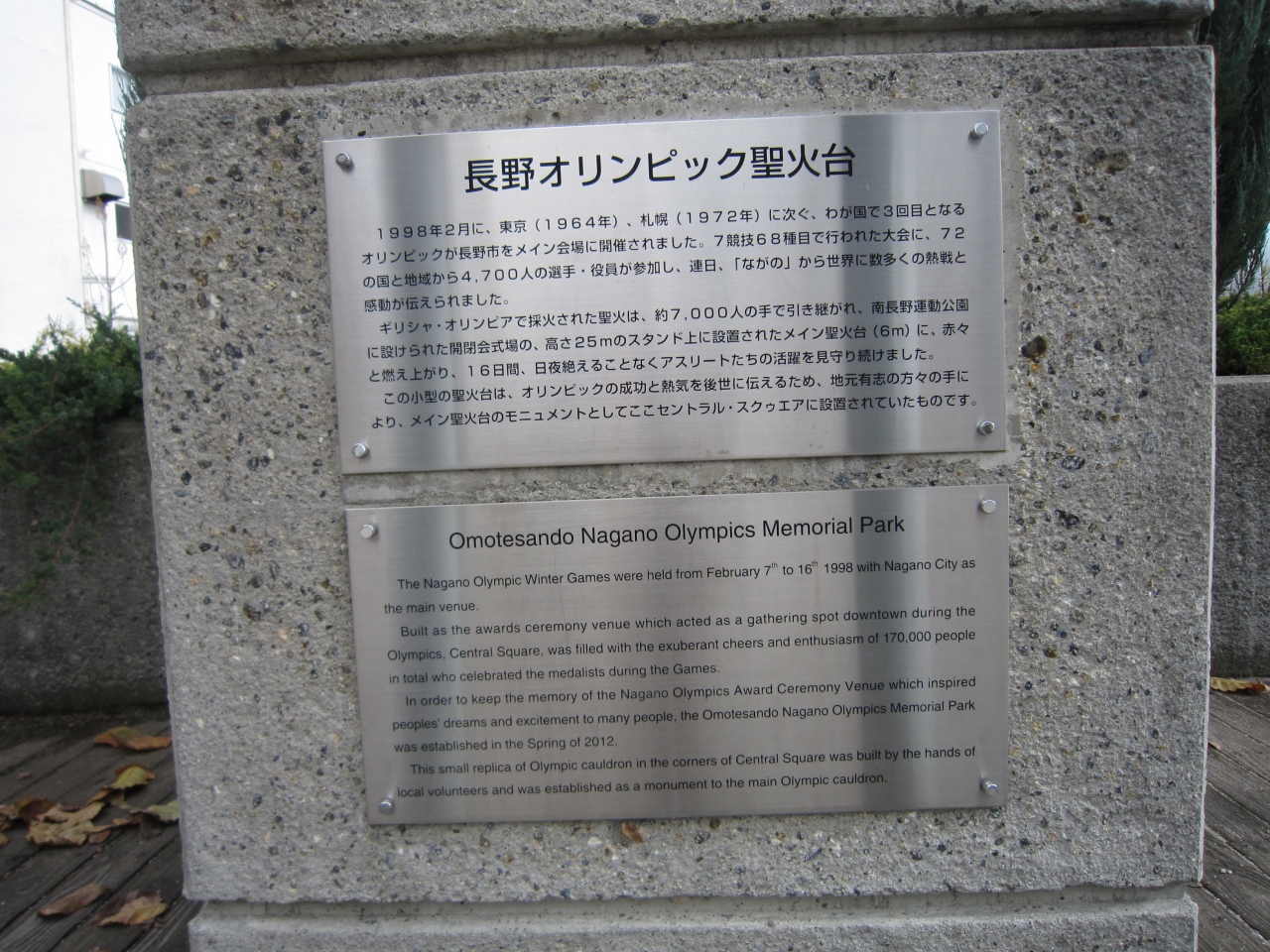 まちのなかの表彰式会場でメモリアルパークとして整備され、オリンピックの成功と熱気を後世に伝えるためメイン聖火台のモニュメントととし設置されたそうで表彰台もありました。当時は凄い熱気だったのでしょうね。現在メモリアルパーク以外は善光寺まで徒歩13分の駐車場となっており有効活用しているようです。