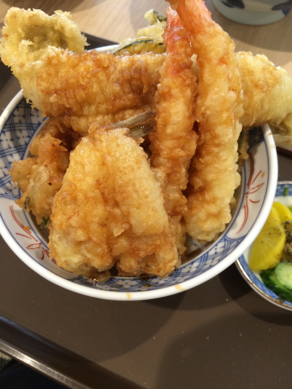 週末だったので、随分待ちました。20分くらい並んだかな。注文してからも10分ほど待ちました。でも、安くて美味しい天丼を食べられるので気になりません。揚げているかたが年配の男性2人だったので、ちゃんとしてるなっていう印象でした。せっかくなので、特上天丼990円にしました。海老と穴子が両方食べたくて、両方食べられるのは特上しかなかったので(たぶん)。さくさくで美味しく頂きました。