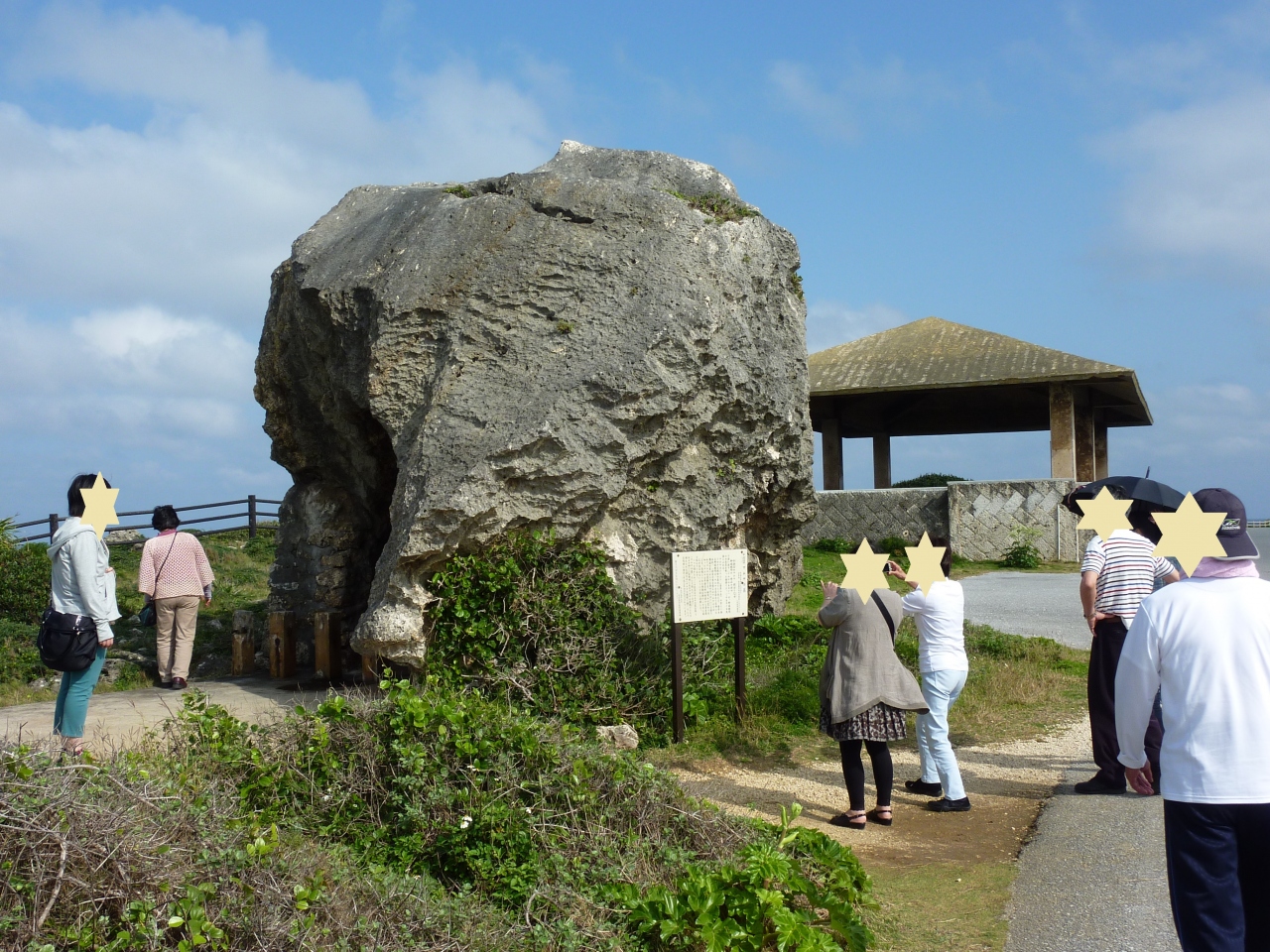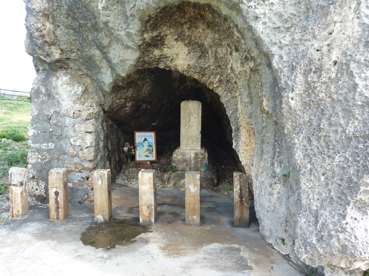 大きなごつごつした岩で、裏に回ると穴が開けられ、中に墓石と遺影(絵?)が飾られています。平安名崎灯台まで行くなら、その途中にあるので、立ち寄ってみても良いかなと思います