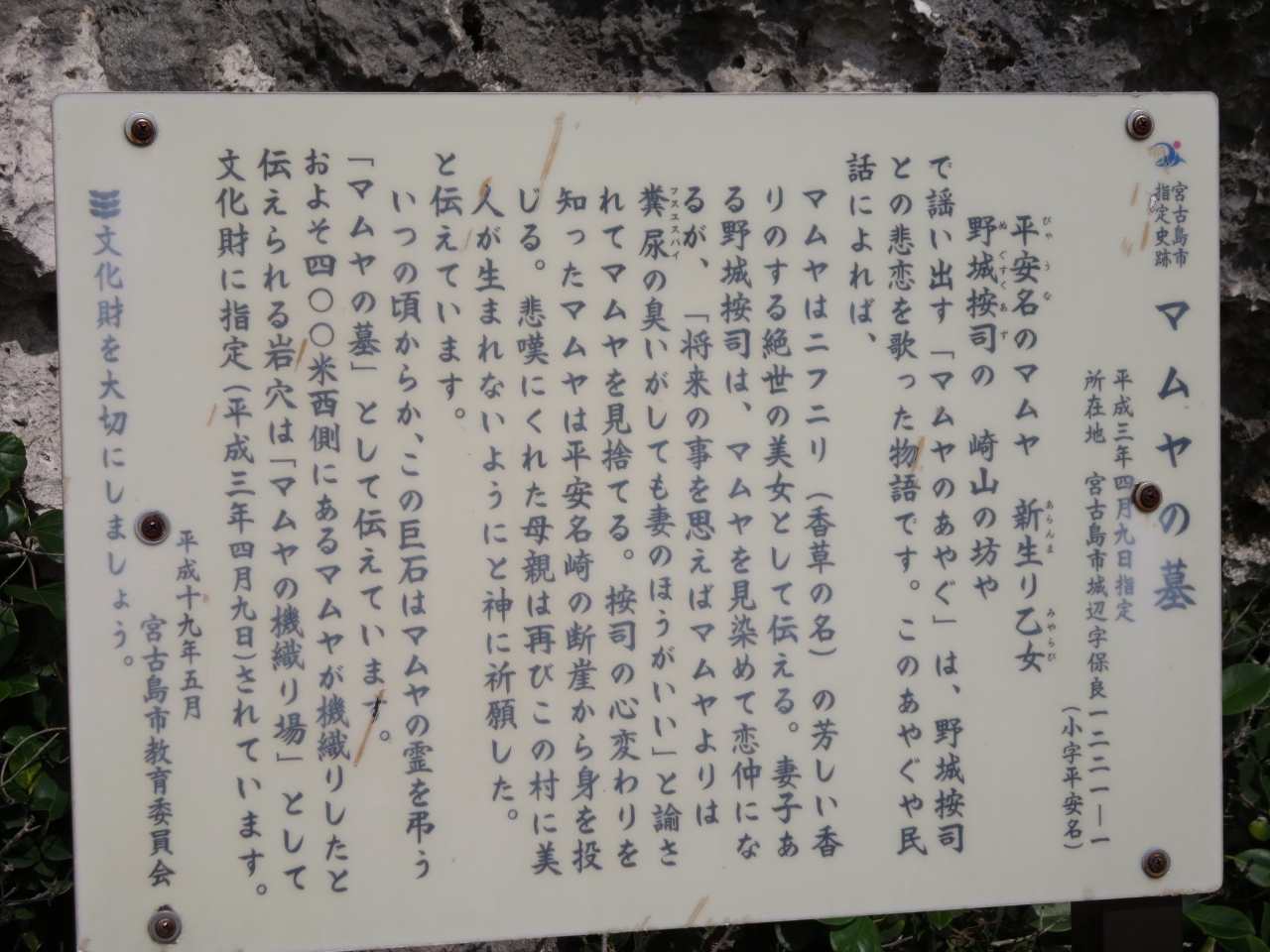 東平安名崎の駐車場から歩くと左手に大きな岩があり、「マムヤの墓」の説明版があります。妻帯者の男性と恋に落ち、捨てられた女性が平安名崎の断崖から見を投げ、この巨石がマムヤの霊を弔う墓として伝わっているそうです。