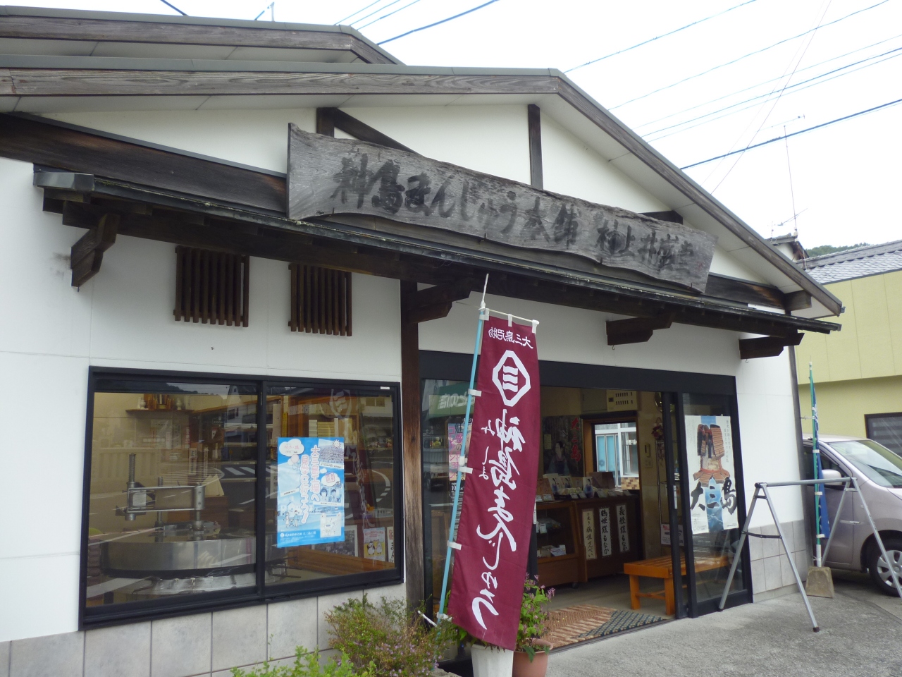 神島まんじゅうをお土産に買いました。大山祇神社の近くにある老舗のお饅頭屋さんです。みかんのはちみつをカステラ生地にまぜてありました。白あんも甘くておいしかったです。自宅用の10個入りパックを買いました。バラでも買えます。