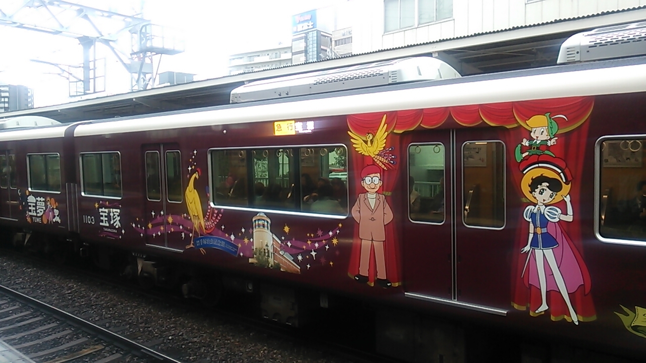 2016年11月27日に梅田9時50分発急行宝塚行きの車両を見たところ、宝塚歌劇団のラッピング車両が使用されていました。