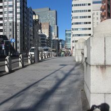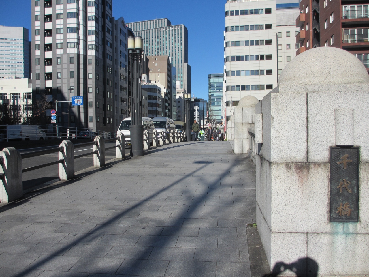 築地・中央市場通り沿いに架かる短い橋です。かつては築地川に架かる橋でしたが、東京オリンピックの際に埋め立てられ、今は首都高速道路の上に架かっています。とりたてて変わった橋ではありませんが、橋の両側には公園が設置され、ビジネスマンの休憩場所になっています。長い年月を表す千代という名に快い響きが感じられる橋だと思います。築地市場まですぐなので、築地を訪れた際に渡ってみてください。