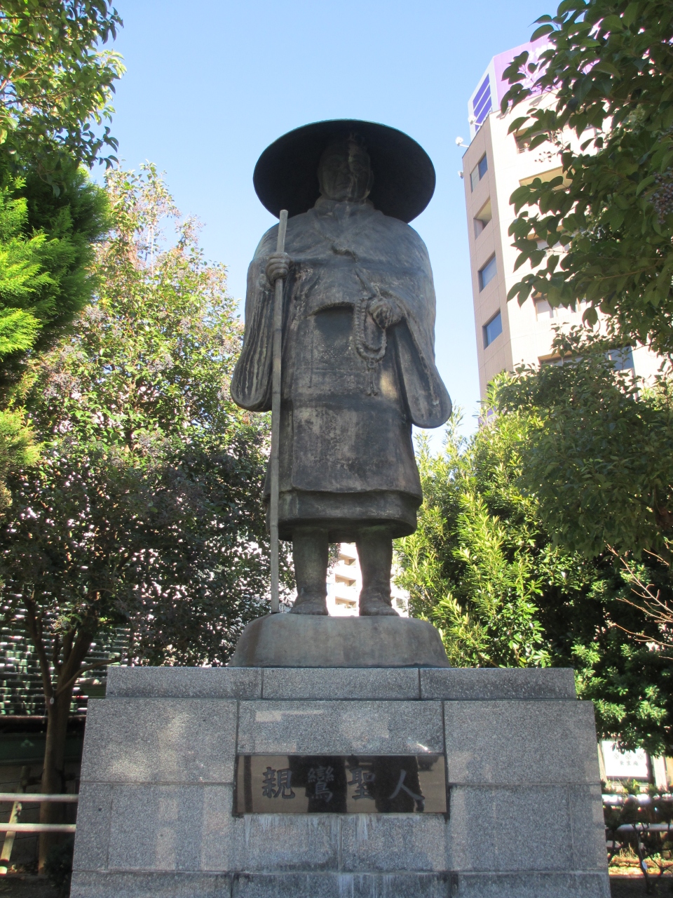 築地本願寺正門を入って左側に建つ、高さ3.5mほどの親鸞像です。寺巡りをしているとよく見かける親鸞像ですが、ここの像は大きく堂々としていて立派です。本願寺の隅から、本願寺全体を眺め、人々や寺の幸せを見守っているように感じられます。大きな本堂に加え、三つある門も重要文化財に指定されているので、本願寺を訪れた際にはこれらの文化財と共に、是非見てほしい宗祖の像だと思います。