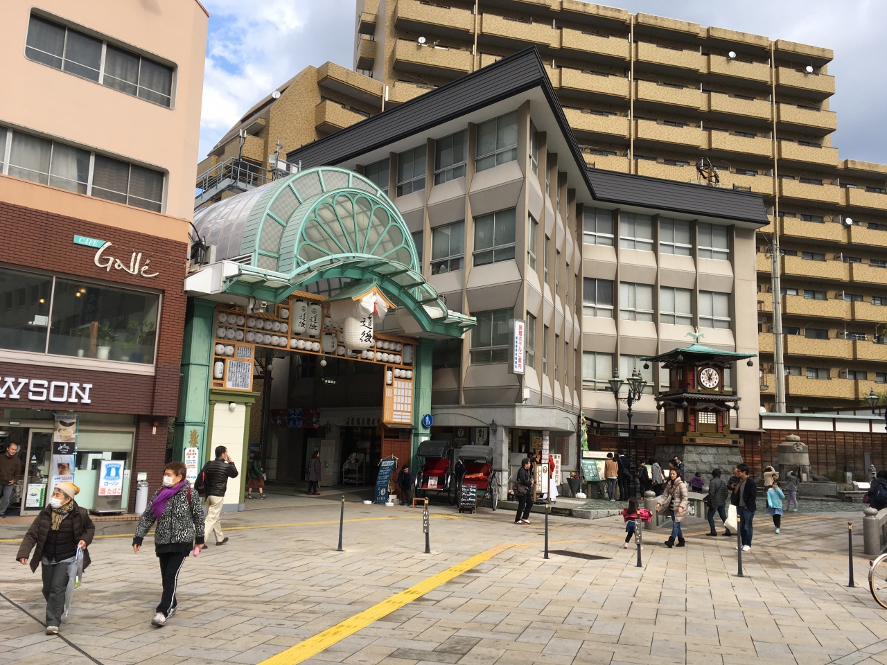 道後温泉のゲートをくぐってすぐにありました。イベントでミカンを絞った100%のミカンジュースのイベントをやっていたのでお店に入りました。近くに温泉が湧き出ている場所もあり待ち合わせなどにもつかえそうです。
