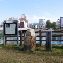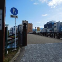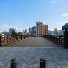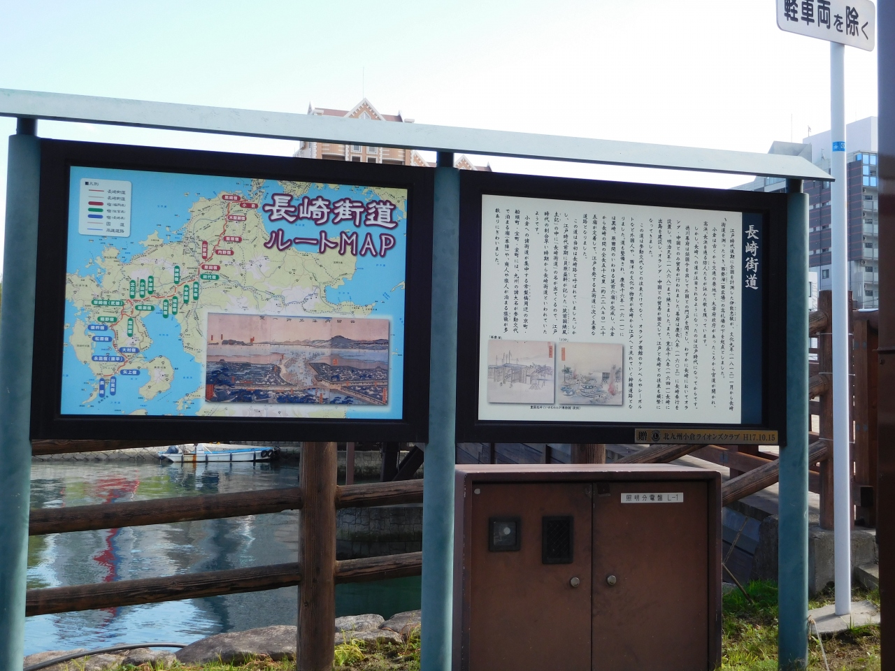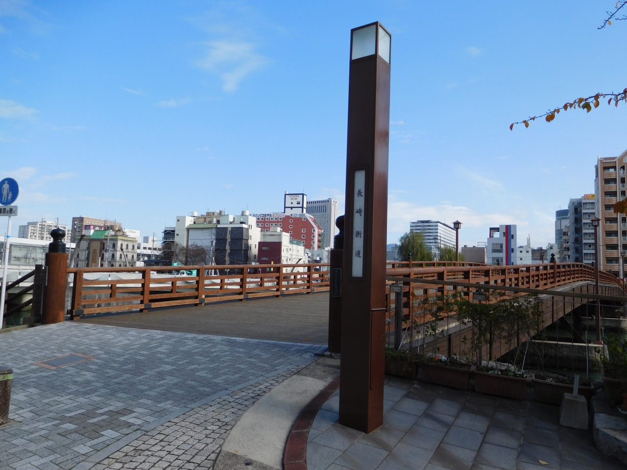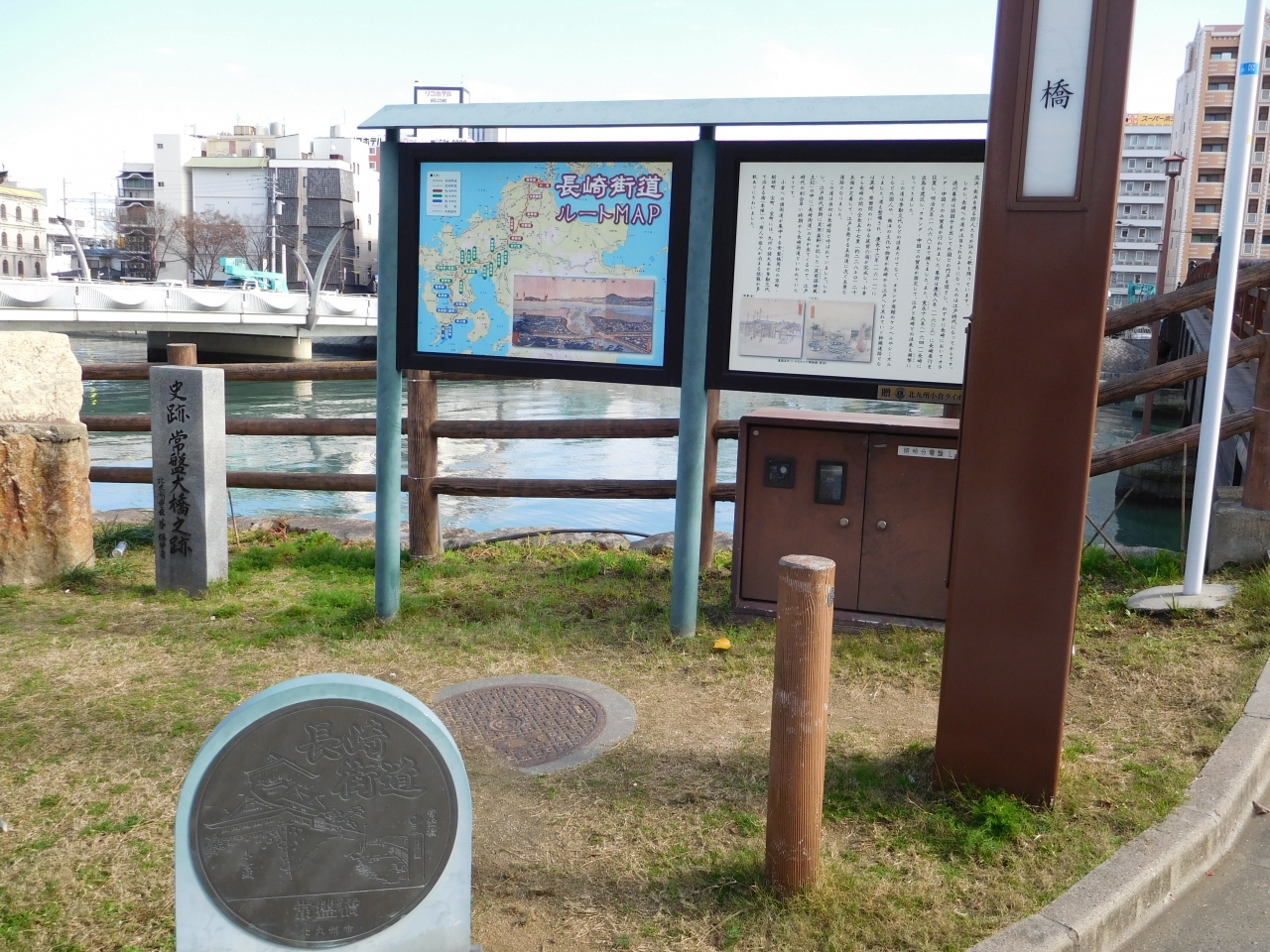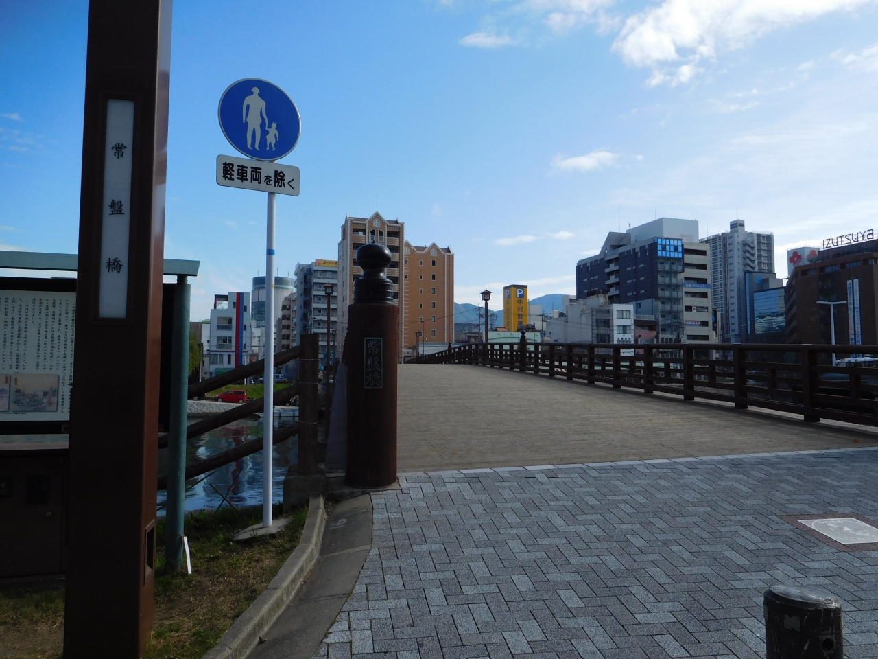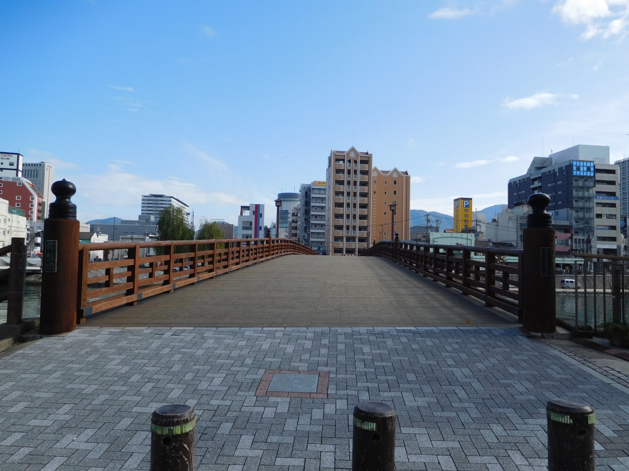 紫川に架かる10橋の一つで、歩行者専用の木の橋です。中央部分が少し高くなっている反り橋で、とても古くからの歴史が感じられるような造りになっていました。江戸時代の五街道の起点でもあり、橋のすぐ横には、長崎街道のルートマップや、江戸時代後期の常盤橋を支えていた橋脚の一部もありました。