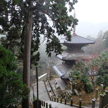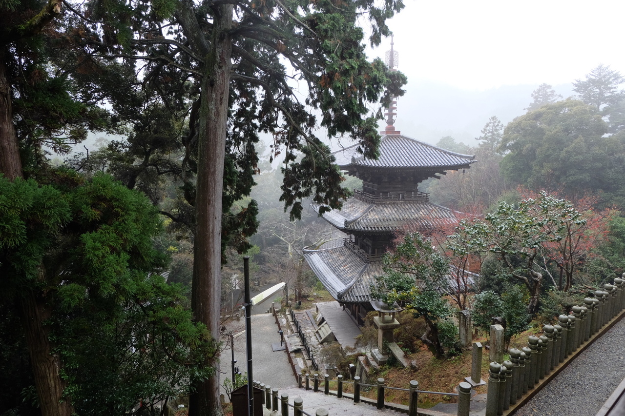 入り口を入ってすぐのところに長い石段があり、そこを登っていくと三重塔が現れてきます。三重塔からさらに階段を上ると本堂があり、そこから三重塔を見下ろすこともできます。雨の中だったためか人も少なく、静かな雰囲気の中でゆっくり過ごすことができました。