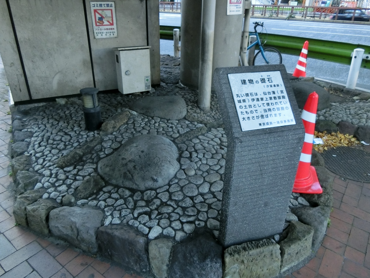 汐留から銀座方面へ。何気なく歩いていると、歩道橋下に何やら案内版が。その案内版を見てみると「建物の礎石」と書かれていました。見渡せば、その案内版の下には大きな丸石がありました。仙台藩伊達家上屋敷御殿の土台として使われていたそうです。それにしても、街中にはいろいろなものがあるものです。