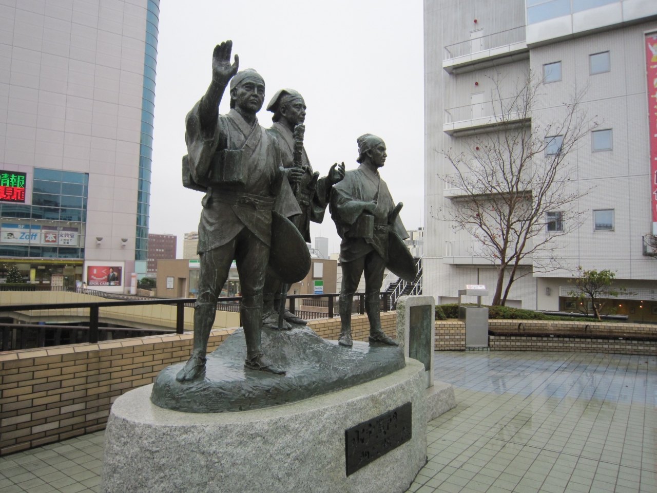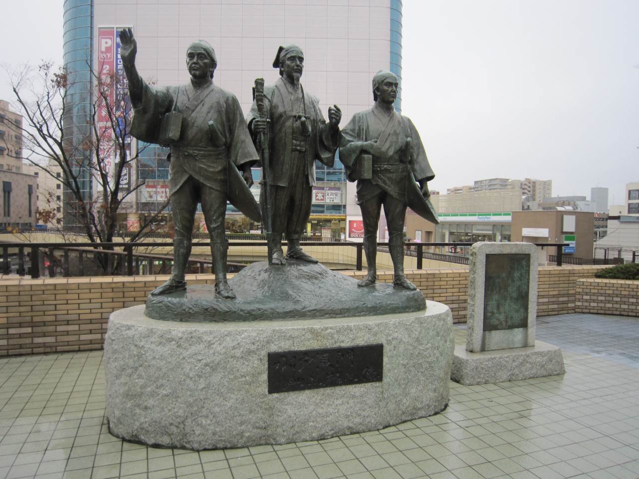 水戸駅改札を出て右側、北口のペデストリアンデッキ右方面に建っています。水戸黄門と助さん格さんの像です。テレビドラマで良く見ていました。水戸駅北口開発事業を記念して光圀誕生の地に隣接するこの地に建立したと説明板にありました。水戸駅には何回も来ており、この像を何度も見ていましたが、じっくりと見るのは初めてでした。駅に着き最初に見えるのがこの像です。生誕地は北口から200メートルです。黄門神社が建っています。雨が降っていたので取り敢えず駅近辺を歩きました。