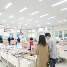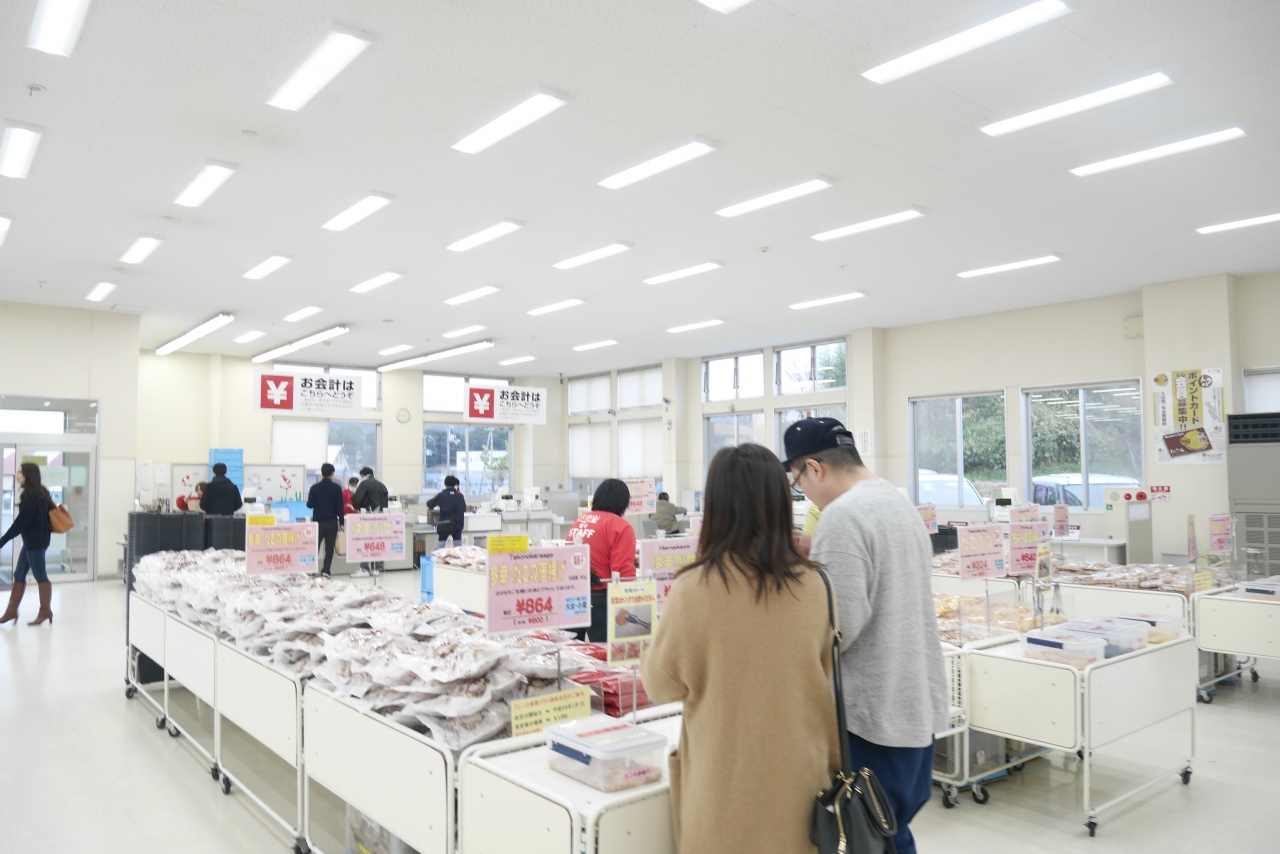 大きな建物の中に、タコせんべいの袋が積まれたワゴンが点在しており
