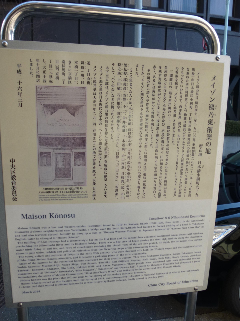 東京証券取引所の近くにある鎧橋を渡ったところで、この案内板を見つけました。現在は、案内板があるのみですが、その内容は、なかなか、興味深いものでした。明治43年に日本で初めてカフェと名のついたお店の開業した場所だといううことです。バーを兼ねた小さな西洋料理店だったそうですが、永井荷風など文学史に名を遺す多くの人たちが、集まっていたようです。残っていないのが残念です。