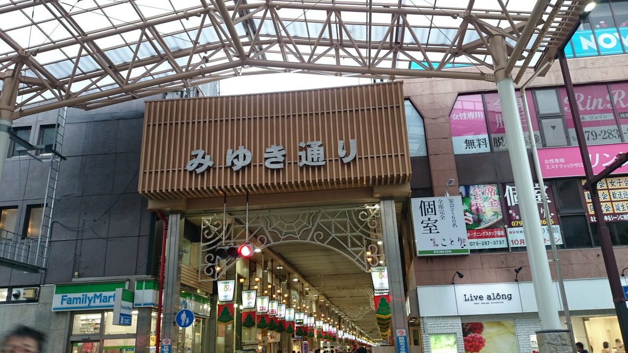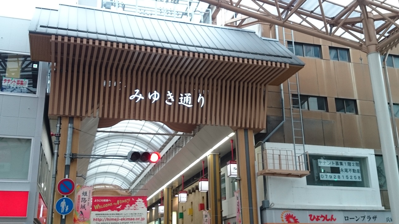 姫路駅北口から姫路城までの1.2キロメートルほど続くアーケード商店街です。昭和の時代は人混みで溢れていましたが、最近は北へ行くに連れて人通りが少ないですね。それでも2年ほど前にアーケードが改修されたりして、気持ちよく歩けるようになりました。
