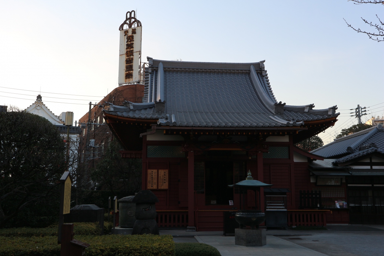 針供養塔、太平和塔、写経供養塔も同じ区画内にあります。針供養でよくニュースなどでも放映される場所でもあります。お堂の写真を撮ろうとするとどうしても、入ってしまう2016年6月に廃業した天然浅草観音温泉の看板が気になってしまう。