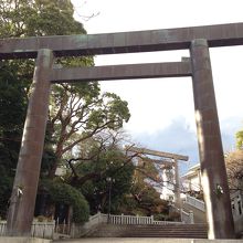 大きな鳥居と幅広い階段 重厚感のある第一印象。横浜総鎮守にふさわしく高台にある境内はすがすがしく みなとみらい地区のそばにあるとはおもえない。シンプルな本殿は間口が開放的でした。