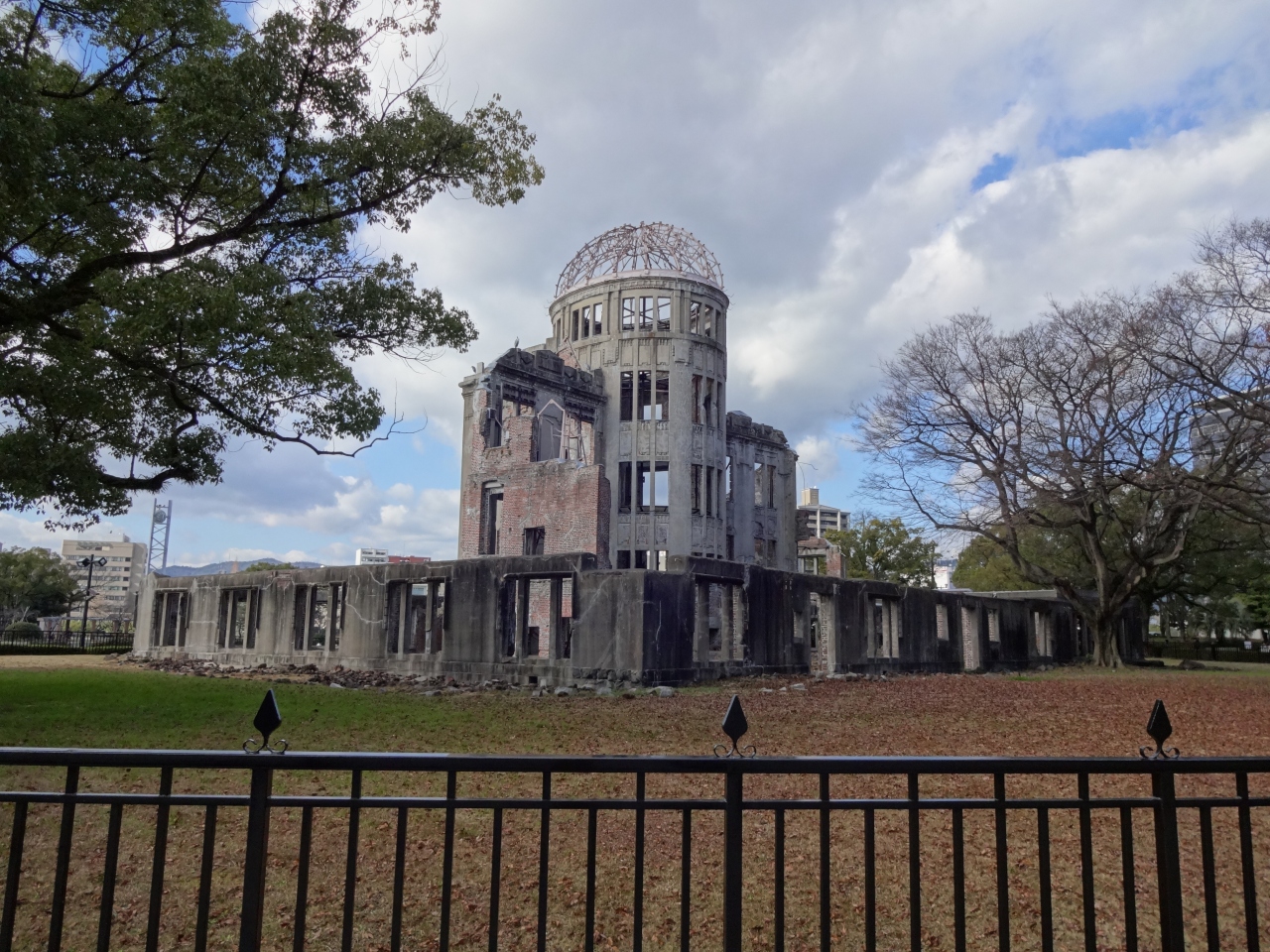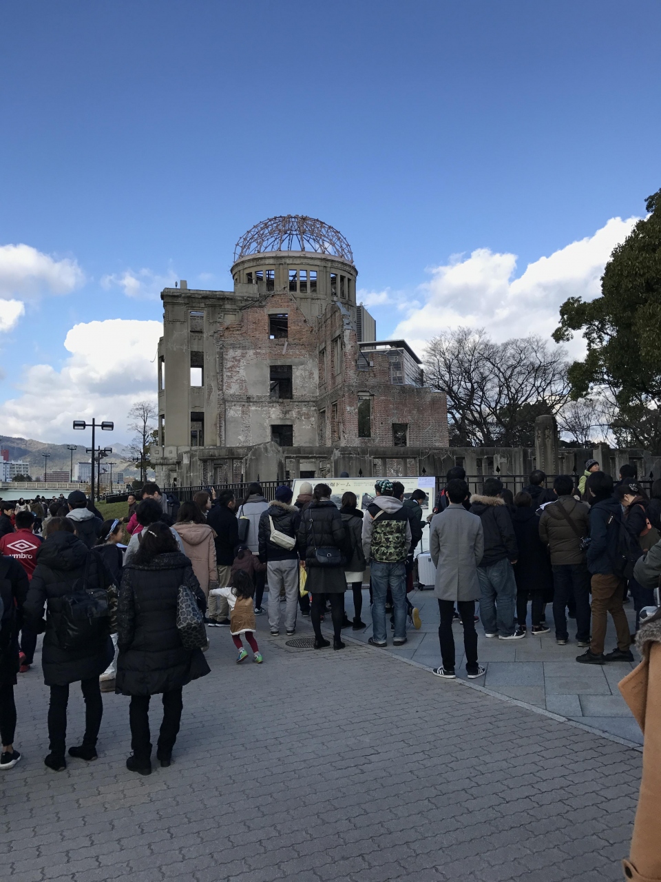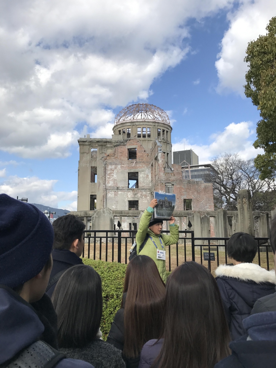 原爆ドーム前で、ボランティアスタッフの方か、紙芝居風にスケッチされた絵や資料を持って、観光客に原爆のむごったらしさや、平和の素晴らしさを語られていた。