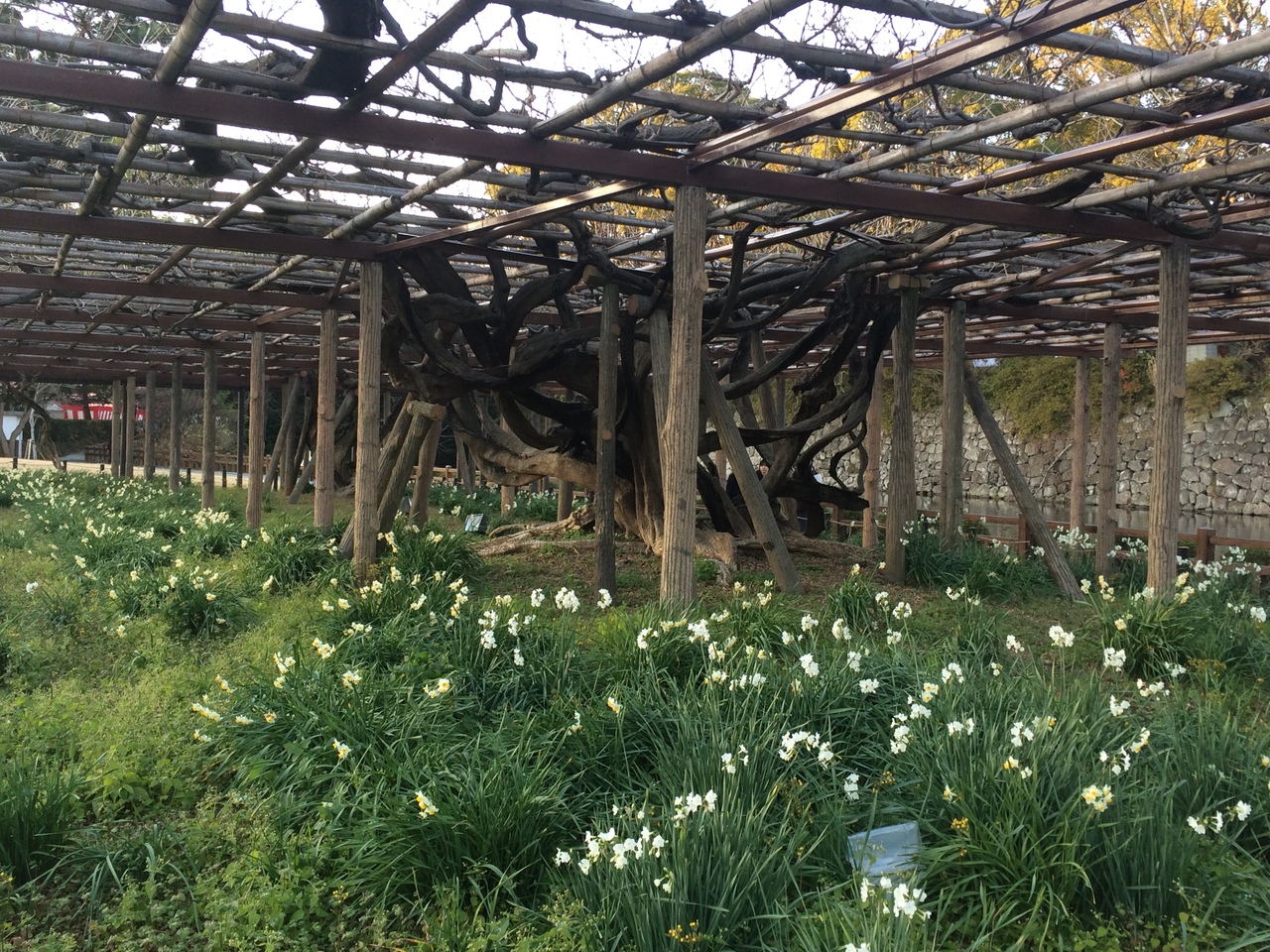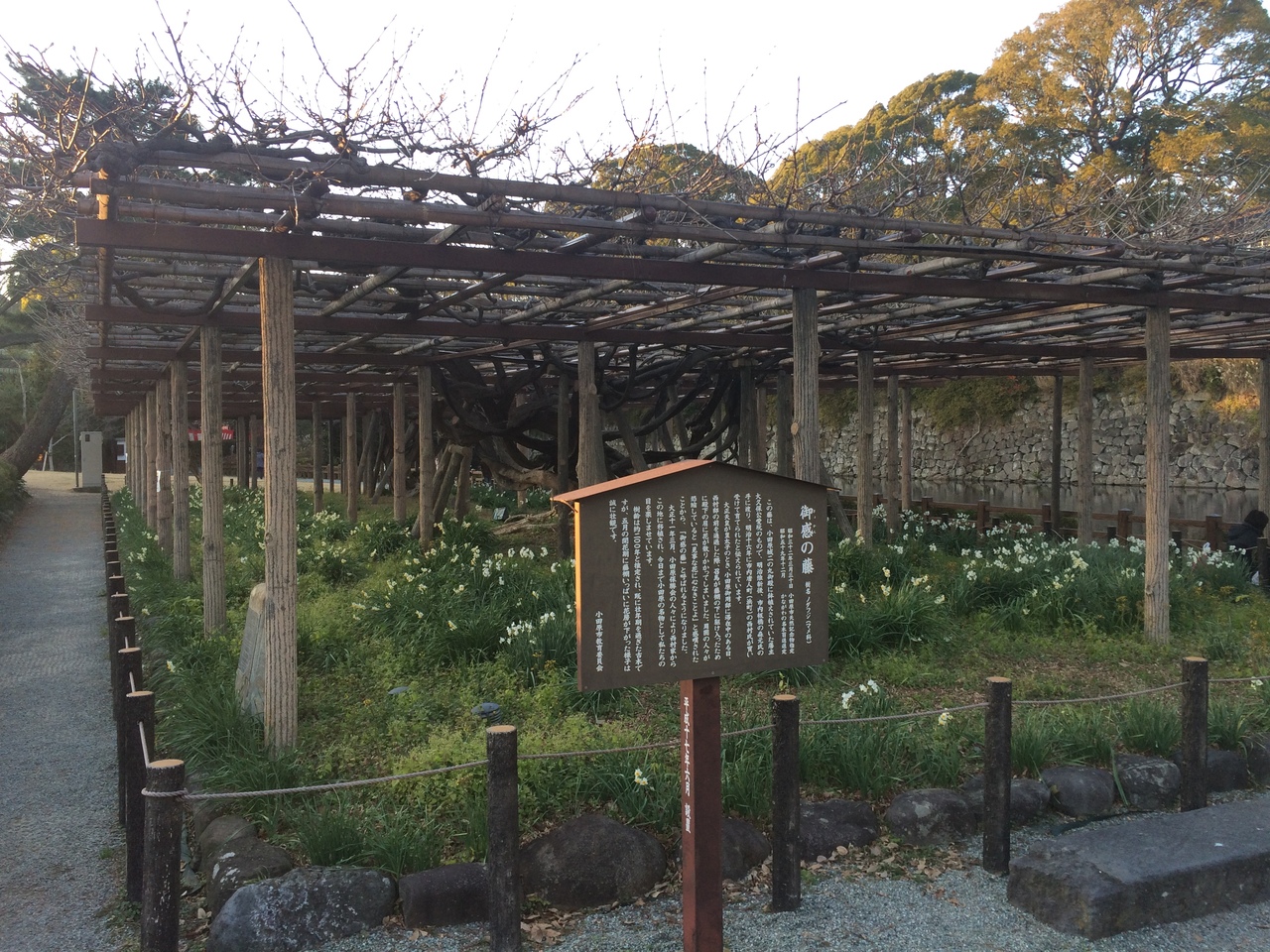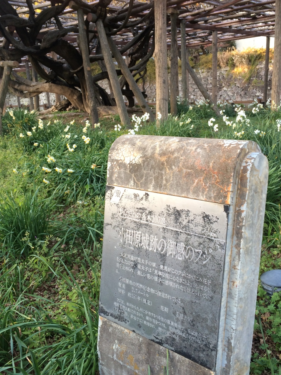 大正天皇が皇太子の時、小田原のある場所を通った時に見事な花だと感嘆されたとのことで今の場所に移されたようです。小田原城のお堀の横錦あり囲いで囲まれ樹齢は約200ぐらいらしいですが壮年期を過ぎた古木とは思うないほど立派に立っていました。