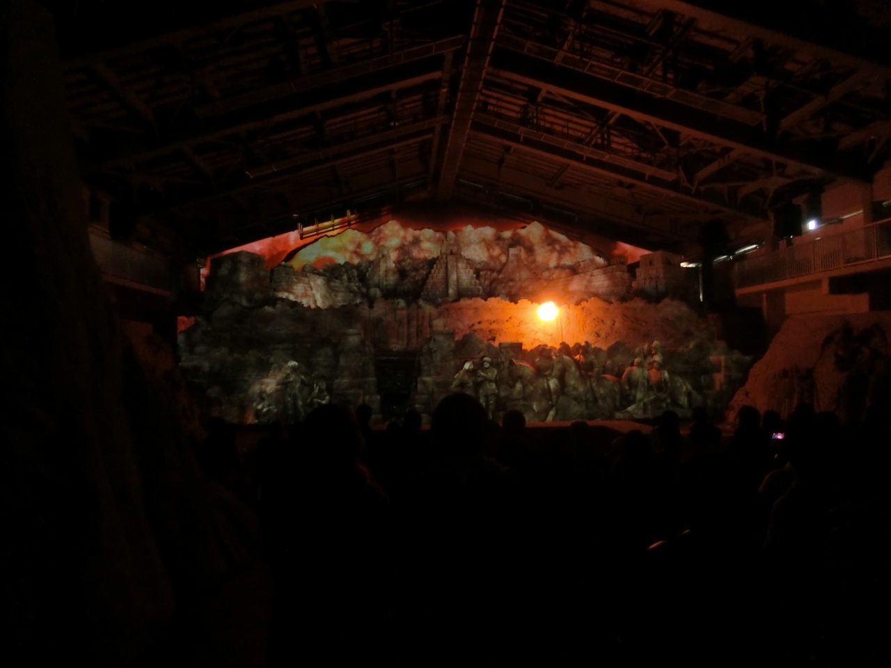 画面と違って実際は場所も広いのであまりすごさが伝わらなそうですが…。場所は展示室内で、作品に投影されます。3階より2階から見た方が高さがあっていてよいのではないかと思います。実際の砂像は砂の色ですが、そこにうまく映像を重ねて色つきの人々にしたり芸が細かいなぁと思いました。