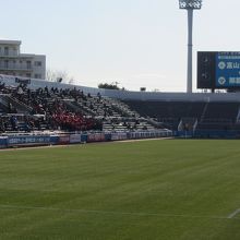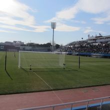 この競技場の特色は、観客席とピッチの近さ。ゴール裏などは本当に間近でプレーを見ることができます(ボールも良く飛び込んできます)。