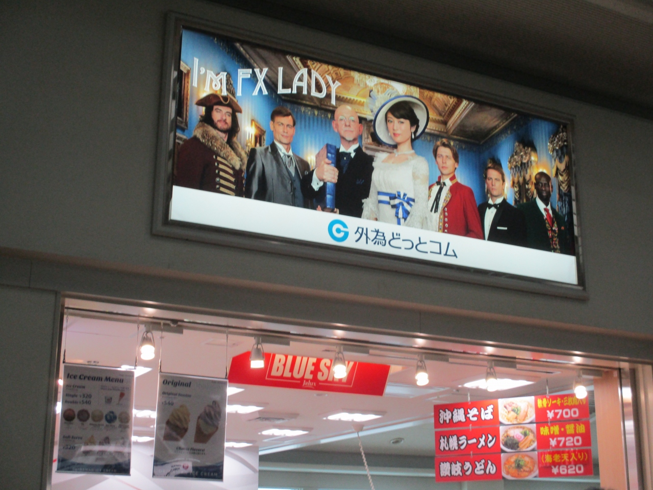 出発直前にお腹がすいた人はどうぞというお店です。麺類のメニューは、沖縄そば・札幌ラーメン・讃岐うどんというのは笑ってしまいますね。アイスクリームやソフトクリームも売っています。ソフトクリームは濃厚で美味しかったです。