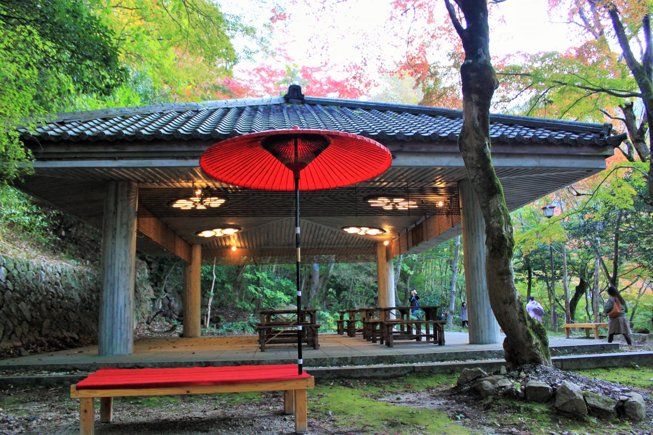 山門を入ると売店と和傘を飾った席が用意されていました。